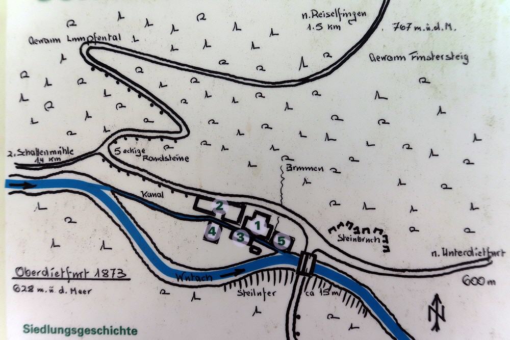 Siedlungsgeschichte. 1786 Wohnhaus mit Schankraum (1), Scheuer und Stallung (2), 1809 Säge- (3) und Gipsmühle (4), 1857 "Personalgastwirtschaftsrecht" für das Gasthaus "Zur Krone", 1850 Getreidemühle (5).