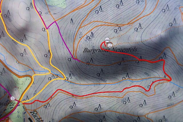 Die Runie der Burg Neuenfels ist über die Schwärze, zwischen Britzingen und Badenweiler, nach 30 Minuten Fußweg mit einem Höhenunterschied von 164 Metern erreichbar.