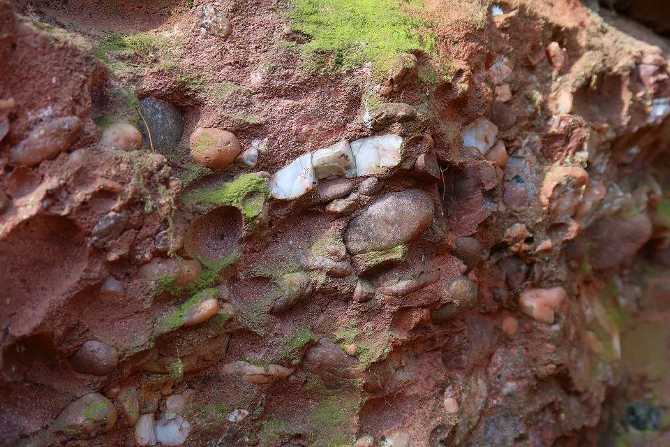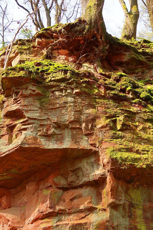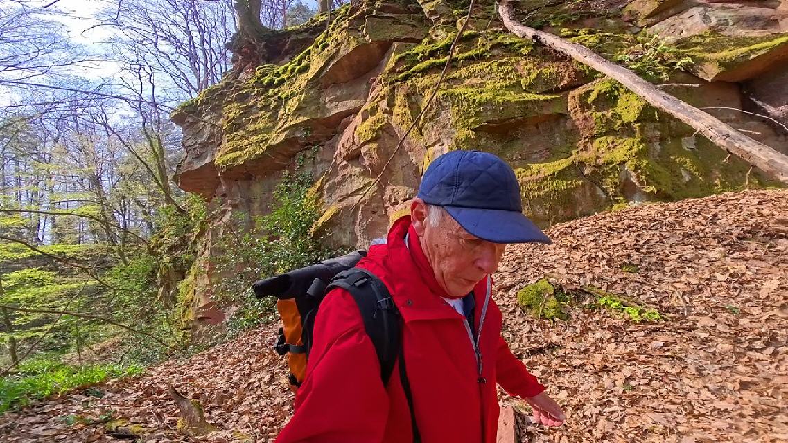 Der Pfad entlang der Steinbrüche stößt auf einen breiten Fußweg, dem man nach links durch steileres Gelände folgt. Sandsteinfelsen stehen am Weg an. Nach rund 250 m des enthalten sie größere gelbe Partien. Mit etwas Glück findet man hellgelbe verkieselte Sandsteine mit dünnen Schwerspatbelägen. 550 m weiter öffnet sich auf der linken Seite eine große und bis zum Kamm reichende Geländemulde. Felsnasen stehen hervor, ansonsten überwiegt Gesteinsschutt. So sieht ein gut 800 Jahre alter Steinbruch aus, der feuchten Klimabedingungen mit starkem Baumbewuchs ausgesetzt ist. Auffällig ist der nun gelbliche Sandstein. Dabei dürfte es sich um den wichtigsten Burgsteinbruch handeln, denn die Burg besteht ganz überwiegend aus gelblichem Sandsteinmauerwerk.