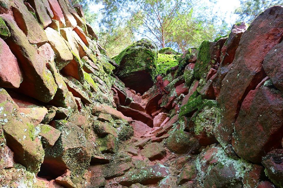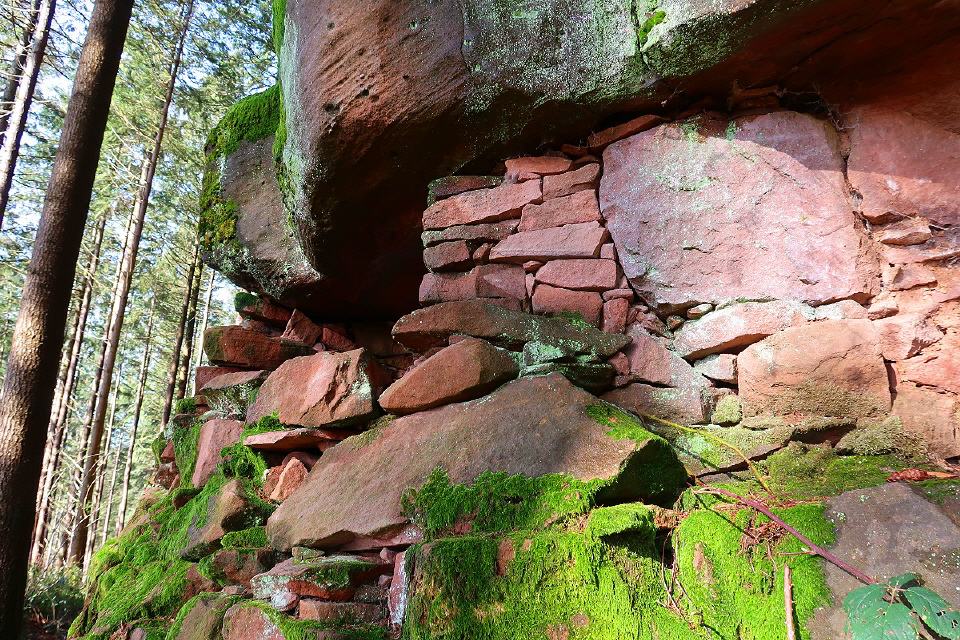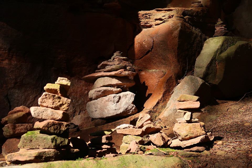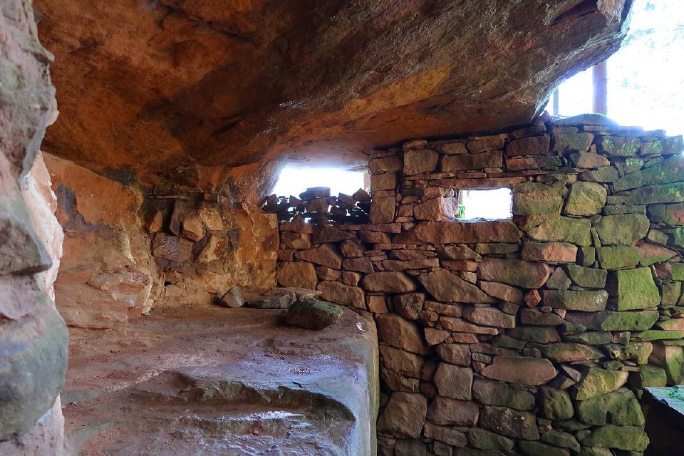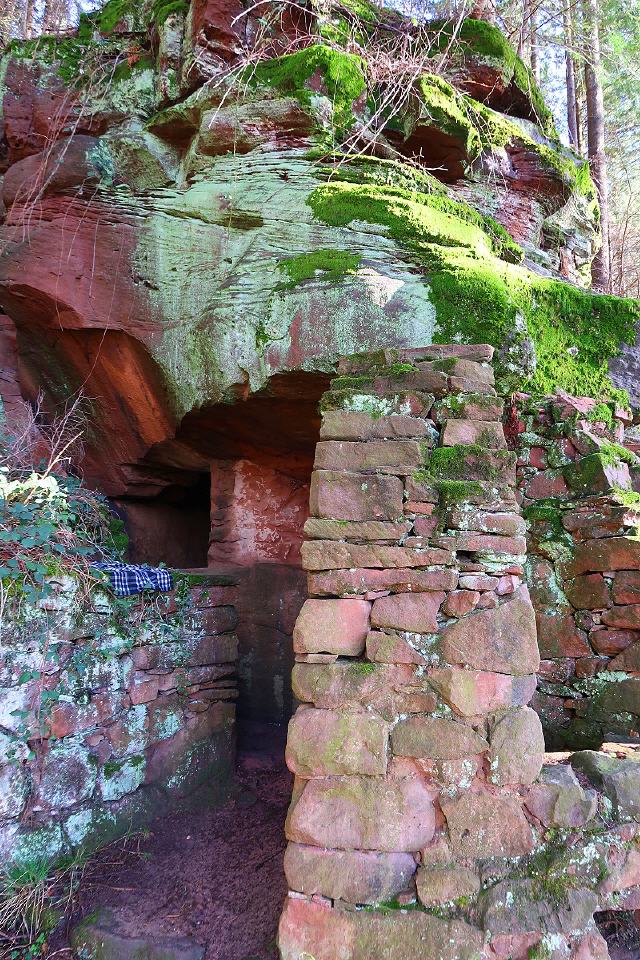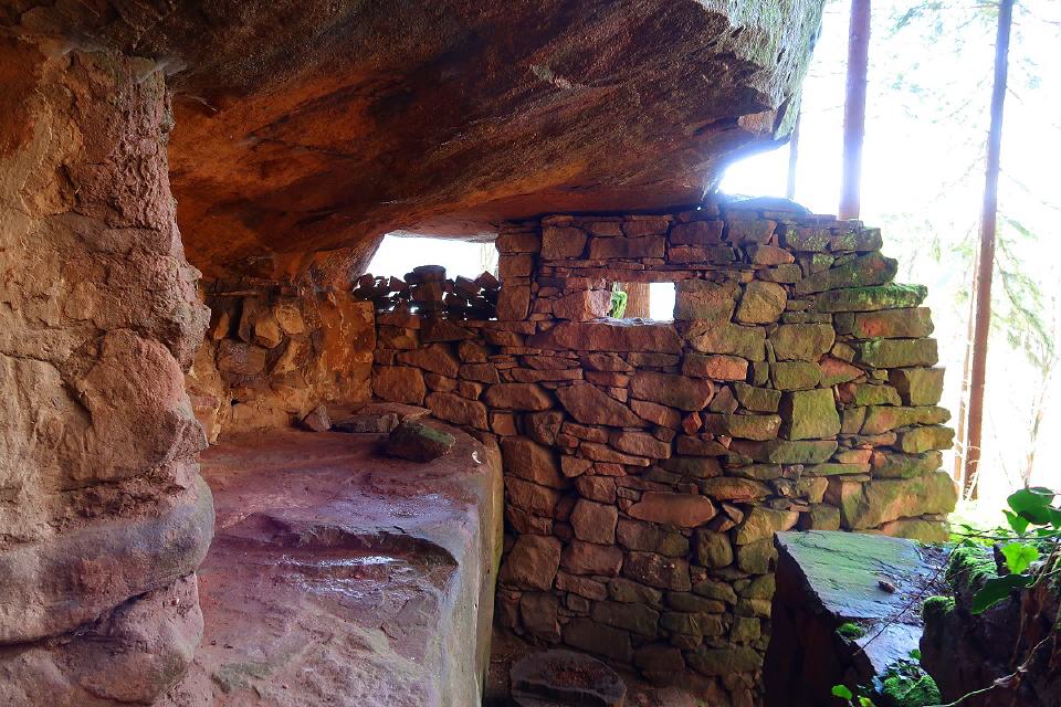 Beeindruckende Felsformationen säumen nun den Weg. Die anspruchsvolleren Passagen werden durch Halteseile unterstützt. Entlang des Pfades findet sich die ein oder andere Spielmöglichkeit in den schönen Felsformationen. Dort hat ein Einsiedler in jahrelanger Arbeit eine Steinhöhle in den Fels getrieben. Heute ist sie verlassen und bietet einen spannenden Blick in das Leben des einstigen Bewohners. Festes Schuhwerk ist unbedingt notwendig.