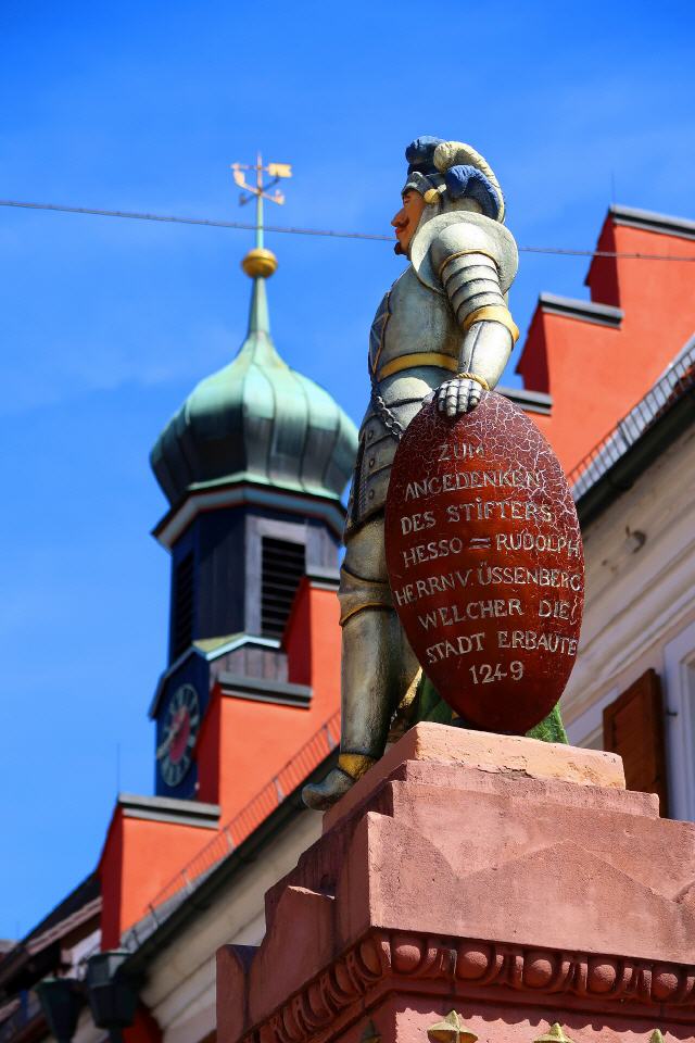 Üsenbergbrunnen: Im Schnittpunkt des stadtbildprägenden Straßenkreuzes steht der 1824 errichtete Brunnen mit dem Standbild des Stadtgründers Rudolf II. von Üsenberg. Das Adelsgeschlecht der Üsenberger tritt bereits im 11. Jahrundert als Grundherr und Kirchenstifter im nördlichen Breisgau hervor. Als neues Zentrum dieser Besitzungen gründete Rudolf II. 1249 auf freiem Feld neben dem Dorf Kenzingen die gleichnamige Stadt. In engem Zusammenhang damit steht das schon 1220 gegründete Zisterzienzerkloster Wonnental, das als Hauskloster und Familiengrablege das religiöse Zentrum der oberen Herrschaft Üsenberg bilden sollte.