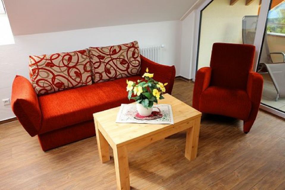 - Stammhaus, Typ B, Penthouse 100 qm, 3 DG, bis zu 3 Personen, 1 Schlafzimmer mit 3 Betten (Doppelbett und Einzelbett, 1 Wohnzimmer mit Sat-TV, Telefon (Direktdurchwahl), Internet, Küche mit Geschirrspüler, Dusche / WC; 2 Loggia (Süd und Nord) mit herrl. Ausblick. Preis: Vorsaison ab 86 €, Hauptsaison ab 89 €