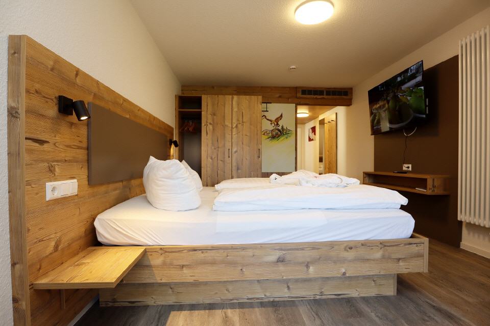 - Suite "Adlerhorst", 62 qm ist für bis zu 4 Personen und mit 2 Zimmer mit je einem Doppelbett, ausgestattet, sowie Badezimmer mit begehbarer Dusche, WC, Haarfön, Kosmetikspiegel, Safe, Minibar, Sat-TV, Internet WLAN (kostenfrei), gemütliche Wohnecke und Balkon mit herrlichem Ausblick zu den grünen Wiesen nahe des Waldes und dem Frischnaubächlein. ab 72 € *