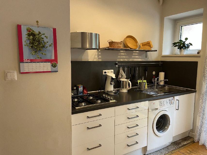 Küche mit gemütlichem Essplatz, 2-Platten-Induktionsherd, Waschmaschine, Kaffeemaschine, Toaster, Mikrowelle (mit Backofen) sowie allem notwendigem Geschirr etc. für bis zu 4 Personen