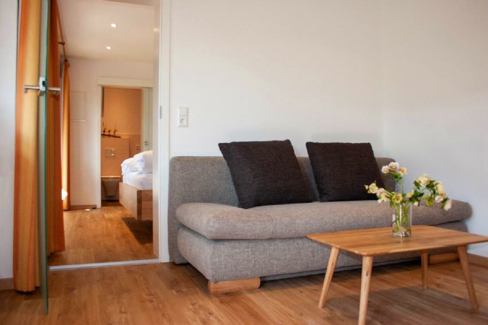 • Das Rosenzimmer ist ein Appartement, ausgestattet mit Wohnzimmer, Schlafzimmer, Badezimmer und kleiner, moderner Küche.