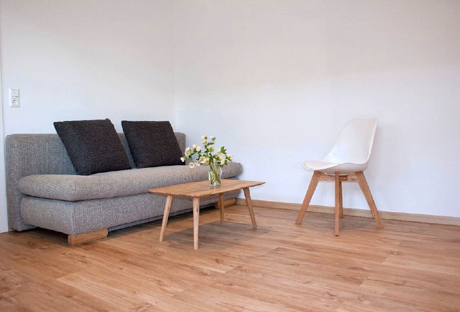 • Das Appartement ist hell, modern und ebenerdig. Das Badezimmer präsentiert sich mit einer großen, begehbaren Dusche. Im Wohnzimmer befindet sich ein Flachbildfernseher.