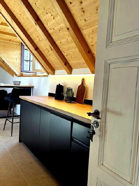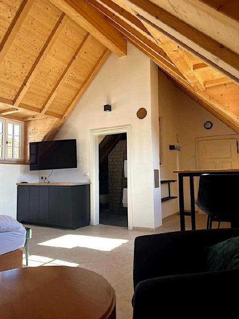Zwei gemütliche Sessel mit Teetisch laden zum Entspannen ein. Ein Echtholz Hochtisch mit zwei drehbaren Hochstühlen eignen sich für Frühstück und Brotzeiten in privater Atmosphäre.