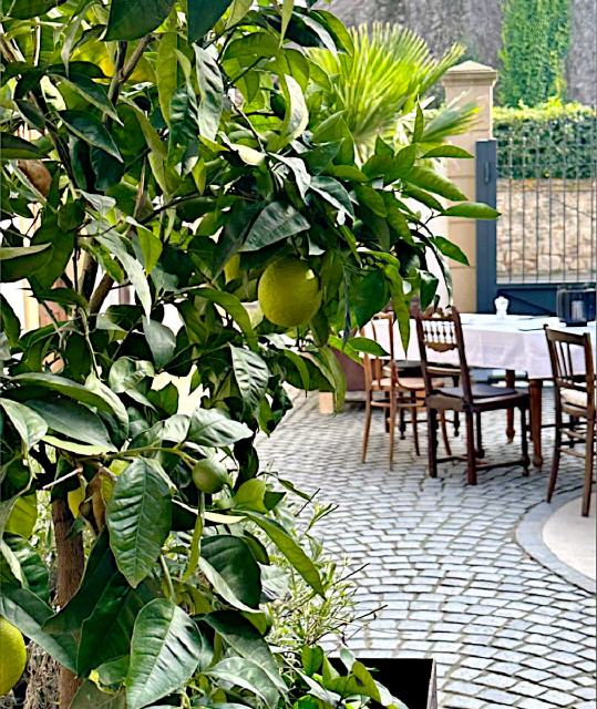 Außenbereich: Großer Obstgarten mit Rückzugsorten und Essbereich im Freien.