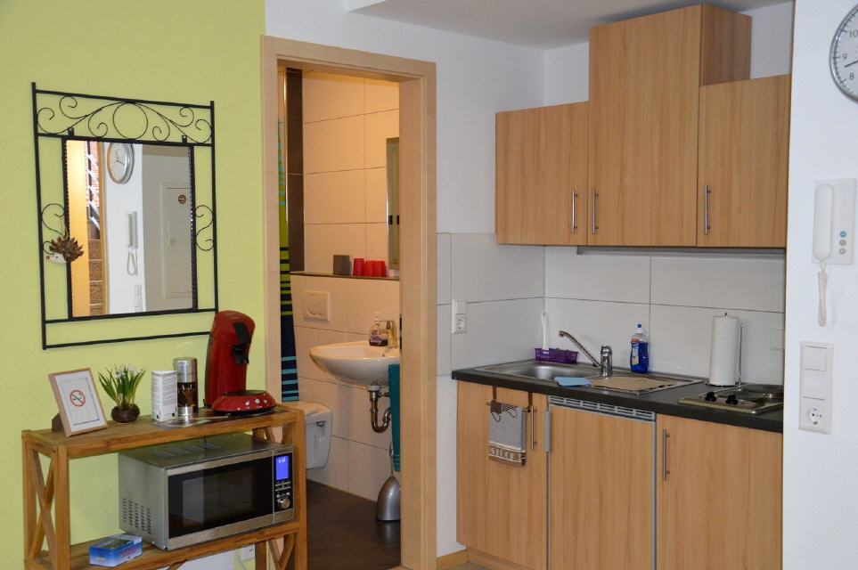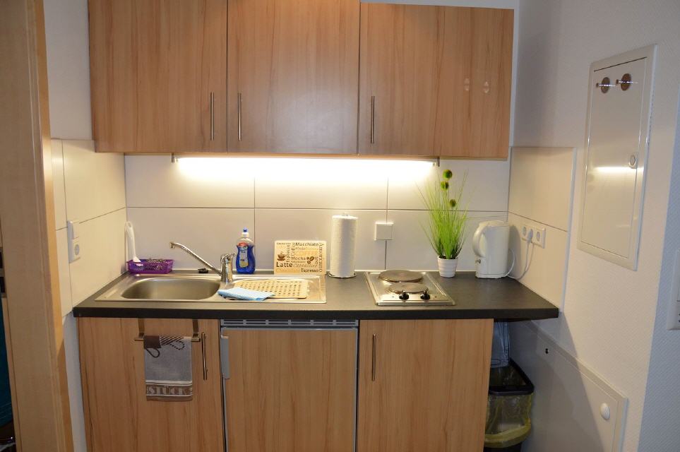 Kühlschrank mit Tiefkühlfach, Herd mit zwei Kochfeldern, Pad-Kaffemaschine, Toaster, Mikrowelle (kein Backofen) Wasserkocher, komplette Kücheneinrichtung mit Geschirr, Besteck, Kochtöpfen usw.