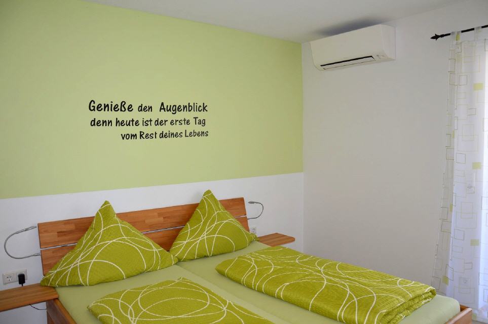 Sie verfügt über zwei separate Schlafzimmer mit jeweils einem 1,80 m breiten Doppelbett. Ein Schlafzimmer verfügt außerdem über ein zusätzliches Etagenbett. Der Wohn-/Essbereich ist mit einer Schlafcouch und Flachbildschirm sowie Essbereich und einer eingerichteten Küche ausgestattet. Das Badezimmer mit Dusche / WC. Für die kälteren Tage besitzen die Ferienwohnungen eine Fußbodenheizung und sind komplett gefliest und deshalb ideal für Allergiker. Haustiere sind deshalb nicht gestattet. Im Sommer steht Ihnen eine Klimaanlage zur Verfügung.