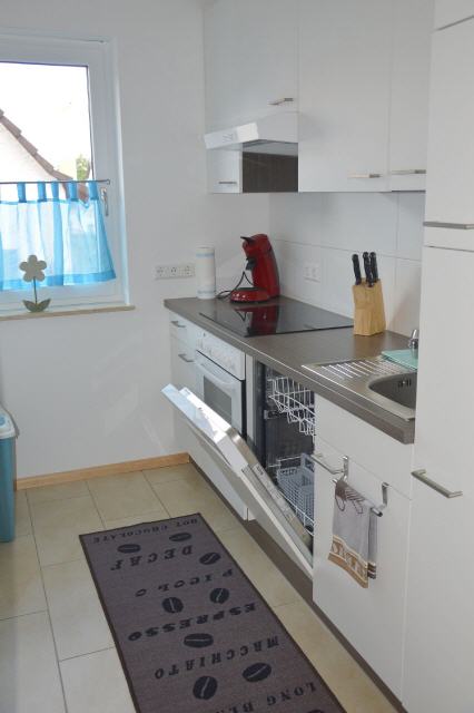 Kühlschrank mit Tiefkühlfach, Cerankochfeld mit Backofen, Pad-Kaffeemaschine, Toaster, Geschirrspülmaschine