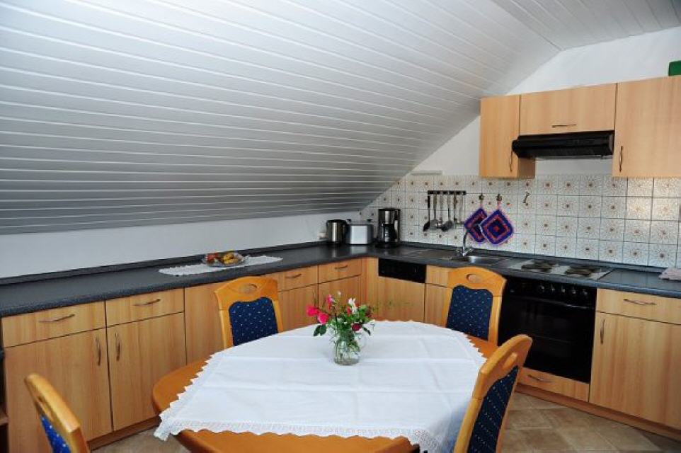 Zu unseren Ferienwohnungen gehören: Blick von Balkon auf Wiese und Wald, Liegestühle und Tisch, Dusche / WC. Wohnung A: 32 qm, 1. OG, für 2 Personen, Wohnraum mit Kochecke, großes Schlafzimmer, neu möbliert, Balkon, diverse Elektrogeräte. Wohnung B: 48 qm, 2. OG, für 2 bis 4 Personen, Wohnküche mit kompletter Einbauküche, Spülmaschine, 2. Schlafzimmer, Bad mit Badewanne, alle 3 Räume verfügen über einen Balkon.