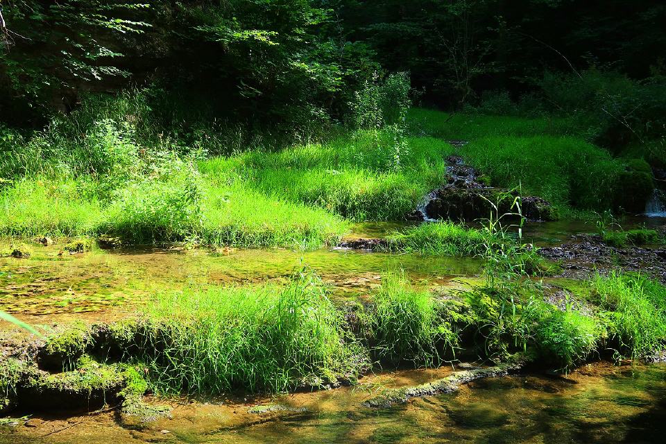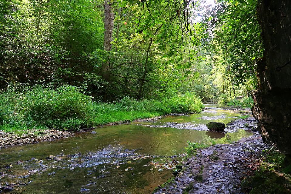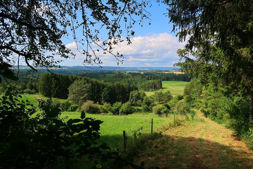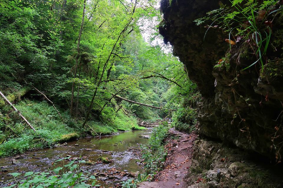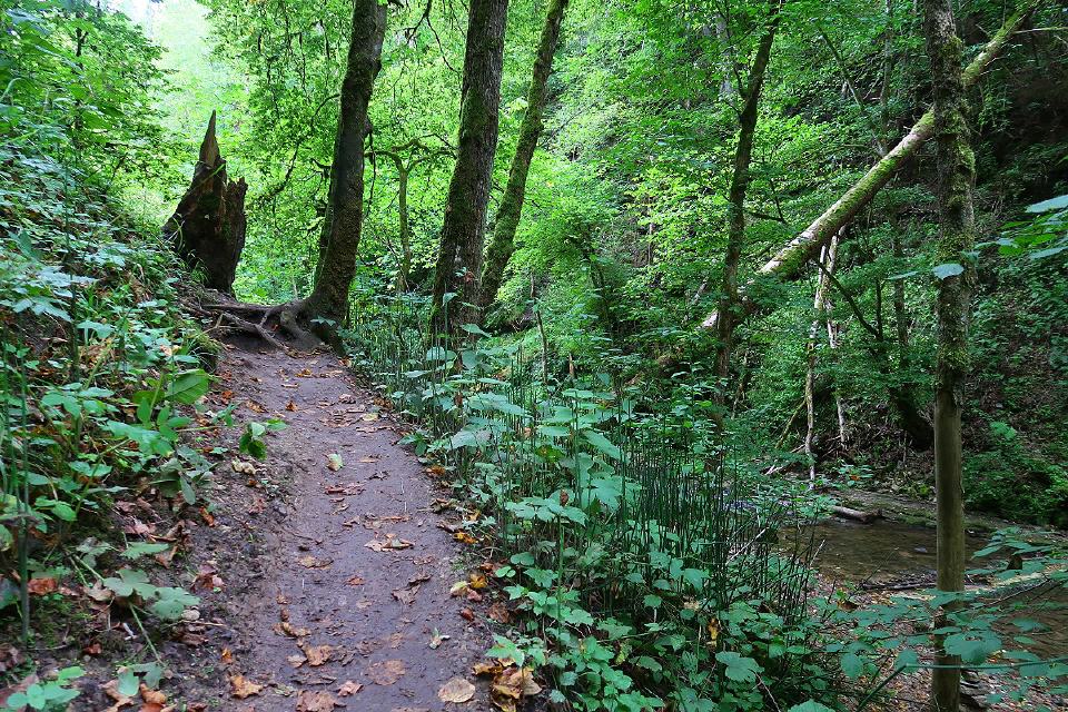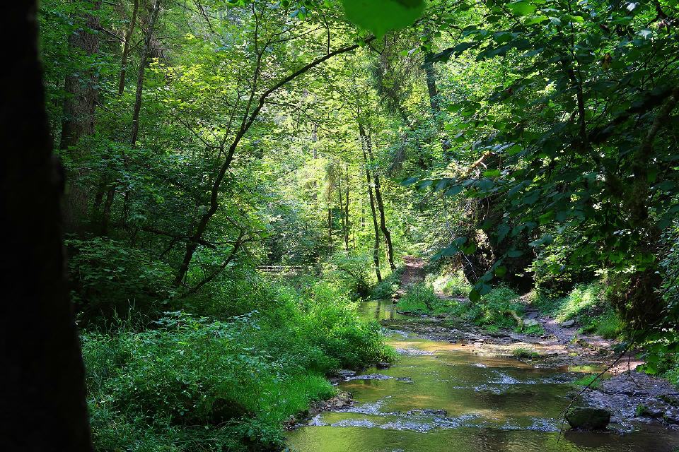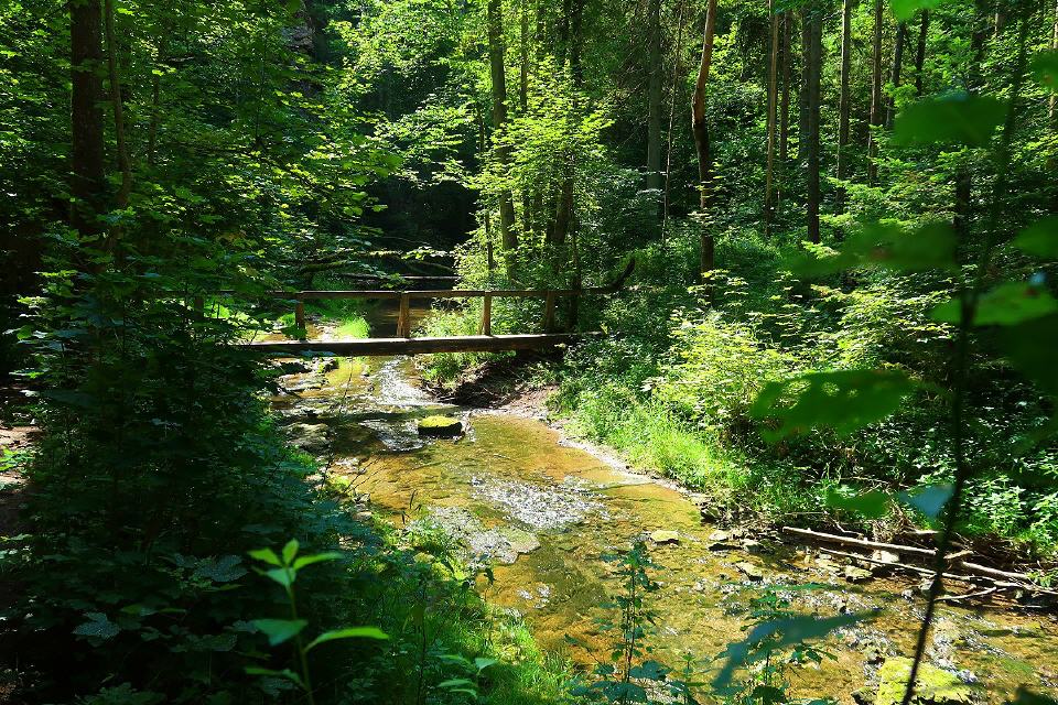 Noch blicken wir weit auf das Umland, das sich links und rechts ausbreitet. Am Waldrand angekommen, biegen wir links hinab und gehen danach beim Fahrweg halb rechts weiter. Ausgedehnte Wiesen und Wälder bestimmen das herrliche Landschaftsbild. Beim Jägerhochsitz am Waldeck wenden wir uns rechts dem Schotterweg zu und ab dem Steinkreuz fällt der Weg nun auch deutlich steiler talwärts ab. Wir wandern im Wald an der Gabelung rechts weiter. Der anfangs noch breite Weg verjüngt sich bald und führt unweigerlich immer tiefer in den Talgrund. Deutlich ist jetzt bereits die feuchte Kühle zu spüren. Schon bald erreichen wir einen hölzernen Steg, auf dem das lauschig und gemütlich dahin plätschernde Balgenbächle (652 m) überquert wird. Danach leitet der schmale Wanderpfad genüsslich direkt neben dem Wasser flussabwärts. Völlig urig und total romantisch wirkt dieser Wegabschnitt. In ungezählten kleinen Kaskaden rauscht und fließt das Wasser sanft zu Tale.