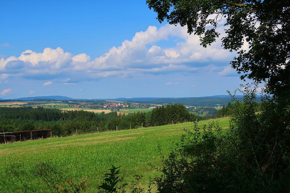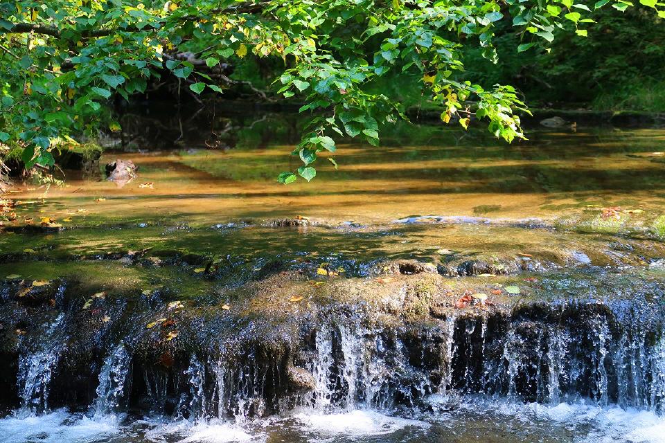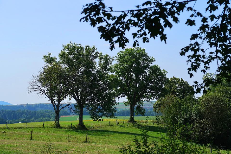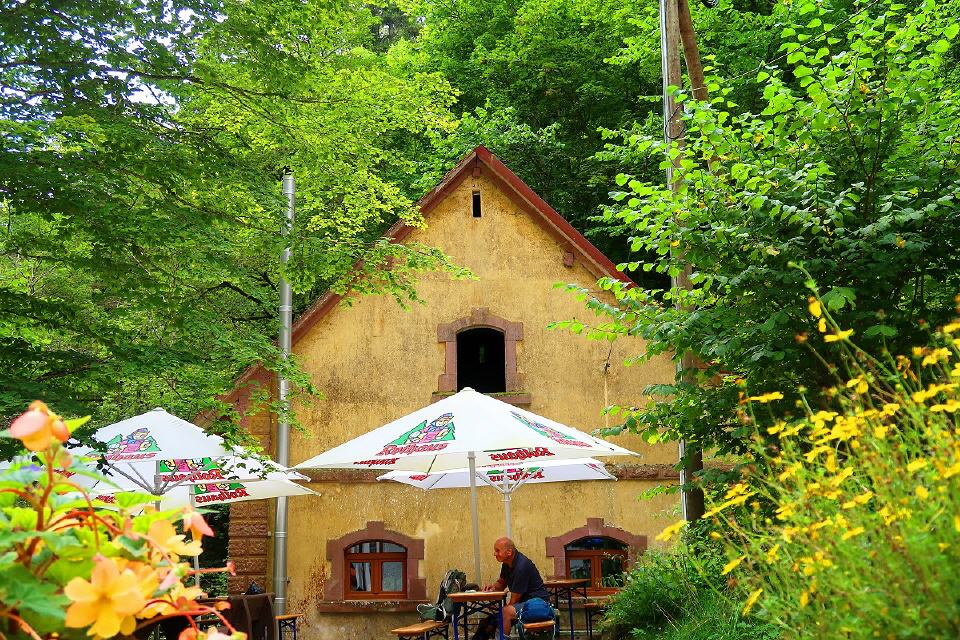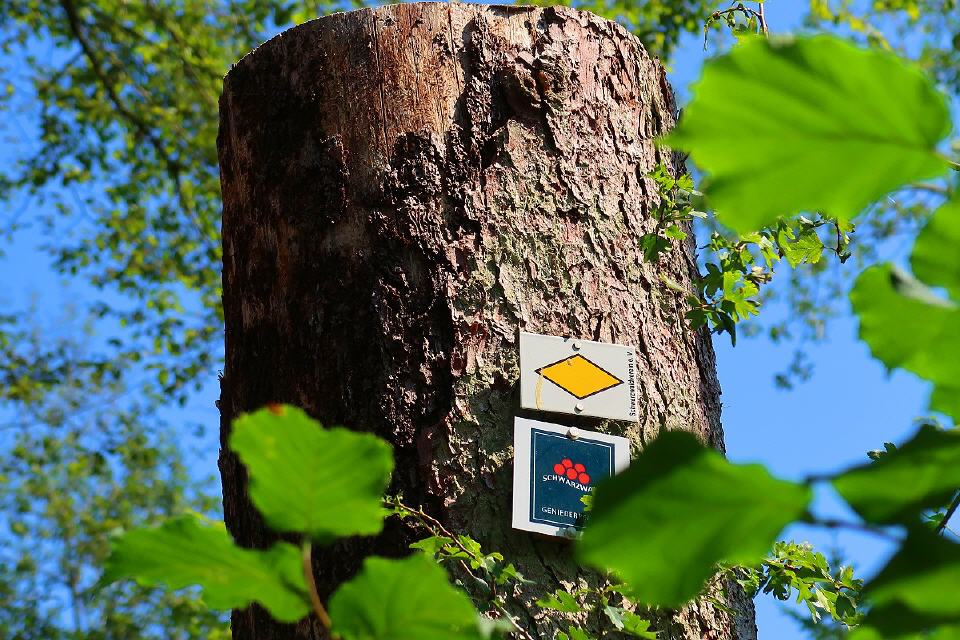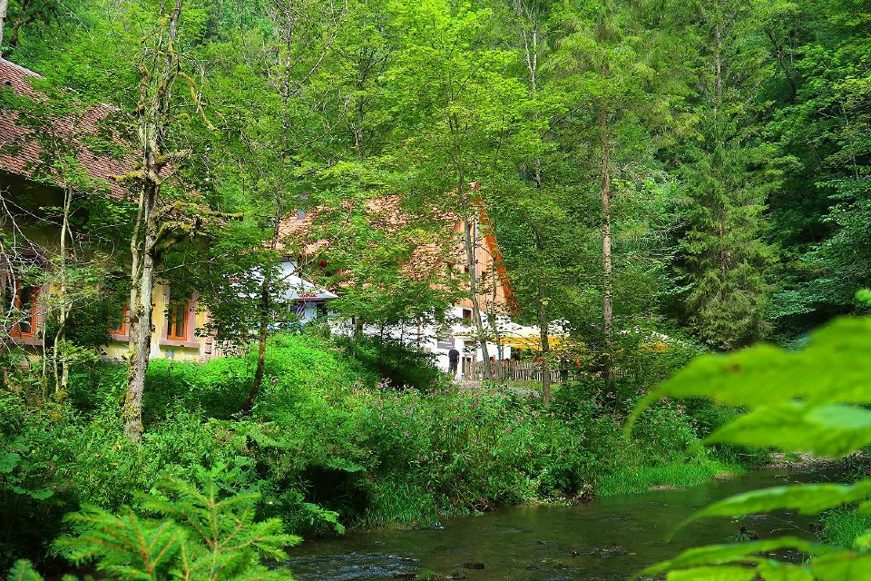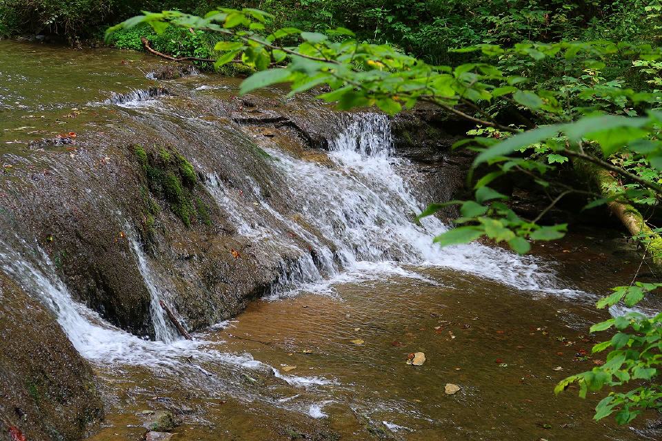 Noch blicken wir weit auf das Umland, das sich links und rechts ausbreitet. Am Waldrand angekommen, biegen wir links hinab und gehen danach beim Fahrweg halb rechts weiter. Ausgedehnte Wiesen und Wälder bestimmen das herrliche Landschaftsbild. Beim Jägerhochsitz am Waldeck wenden wir uns rechts dem Schotterweg zu und ab dem Steinkreuz fällt der Weg nun auch deutlich steiler talwärts ab. Wir wandern im Wald an der Gabelung rechts weiter. Der anfangs noch breite Weg verjüngt sich bald und führt unweigerlich immer tiefer in den Talgrund. Deutlich ist jetzt bereits die feuchte Kühle zu spüren. Schon bald erreichen wir einen hölzernen Steg, auf dem das lauschig und gemütlich dahin plätschernde Balgenbächle (652 m) überquert wird. Danach leitet der schmale Wanderpfad genüsslich direkt neben dem Wasser flussabwärts. Völlig urig und total romantisch wirkt dieser Wegabschnitt. In ungezählten kleinen Kaskaden rauscht und fließt das Wasser sanft zu Tale.