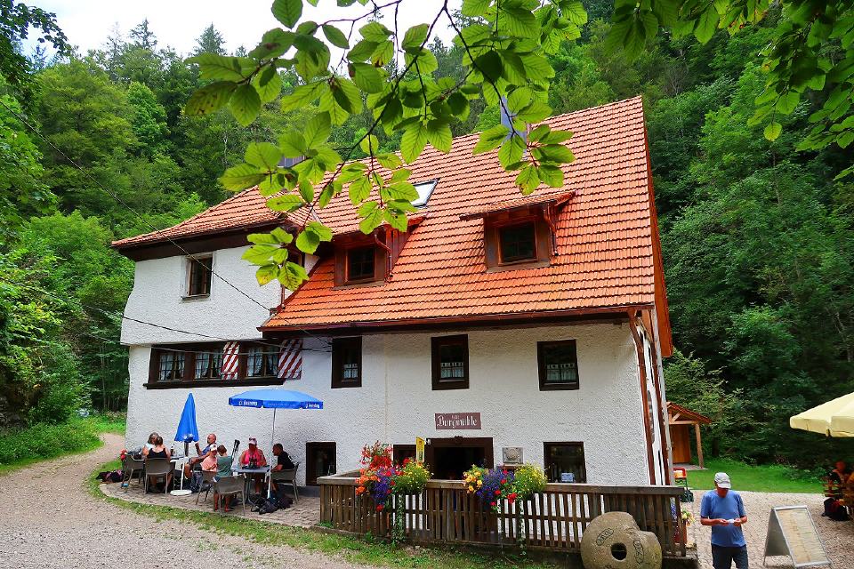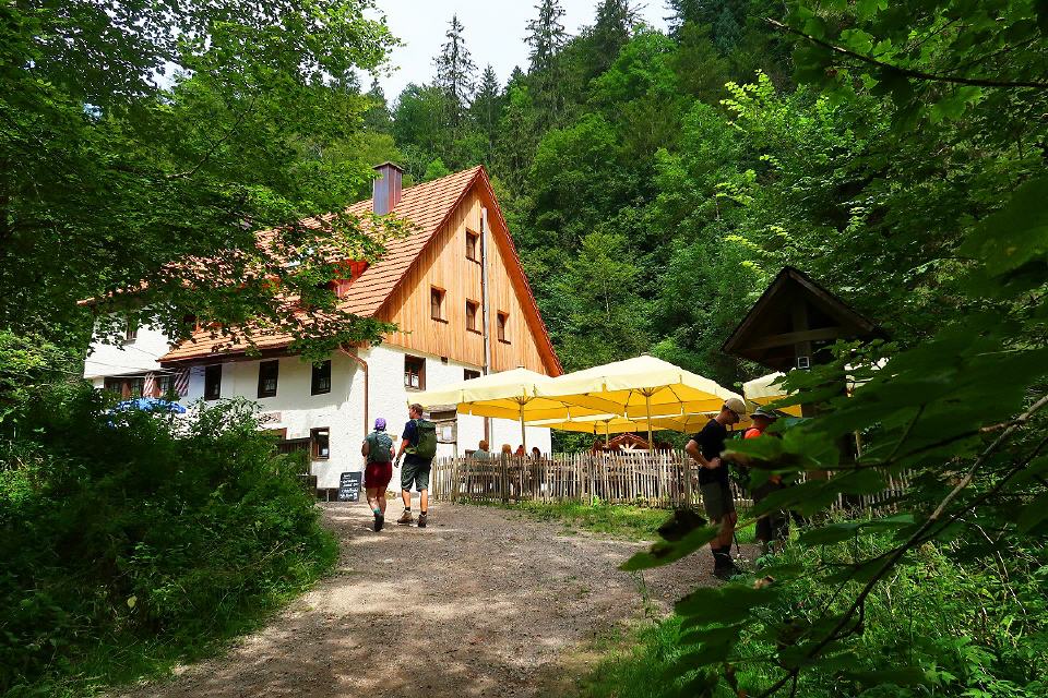 Der Genießerpfad leitet uns auf seiner schmalen Wegspur sicher zum Wegestandort Lochmühle (640 m). Hier trifft das Balgenbächle mit der Gauchach zusammen. Wir drehen uns scharf links und überqueren dann auf einem schmalen Holzbrücklein den quirligen und wild rauschenden Wildbach. Neben der jetzt deutlich breiteren Gauchach geht es beständig stromabwärts. Wanderstiefel mit griffiger Profilsohle sind auf dem schmalen und steinigen Weg äußerst empfehlenswert. Eng führt ein schmales Weglein an Felsen vorbei und eine weitere Holzbrücke leitet uns sicher über das Wasser. Umgestürzte Bäume liegen wild verteilt über der Schlucht, während wir unterhalb einer überhängenden Felswand, direkt auf Wasserhöhe, entlang der linken Uferseite weiter wandern. Wir sind stets auf der Hut, denn die glatt geschliffenen Steine können etwas rutschig sein! Nach einer Engstelle wird der Weg wieder etwas einfacher zu begehen, dann wechseln wir auf einem weiteren Steg die Uferseite. Schon bald wird es wieder etwas mühsamer, denn Steinstufen und Metalltritte verleihen dem Genießerpfad einen gewissen alpinen Charakter. Bald aber ist die knifflige Stelle geschafft und die Gauchachschlucht weitet sich. Nach einem kleinen Wasserfall queren wir die Einmündung der Enge Schlucht, die rechts von Bachheim herab führt. Erneut geht es über die Gauchach und zwei drahtseilgesicherte Abschnitte führen direkt an der Felswand entlang. Dann entspannt sich die wilde Szenerie prompt. Wir wechseln noch einmal die Uferseite und gelangen flugs zur im Jahre 1705 erbauten Burgmühle, wo das Wanderheim zur wohltuenden Einkehr einlädt. Nach der Rast passieren wir frisch gestärkt das alte Turbinenhaus und setzen noch ein allerletztes Mal über die Gauchach. Beeindruckt und fasziniert verlassen wir die Gauchachschlucht und wenden uns links dem bergwärts führenden Burgmühlenweg zu. Nach einem kräftezehrenden Anstieg leitet dieser halbseitig aus dem Wald und die Landschaft wirkt wieder lieblich. Beständig dem breiten Weg folgend, passieren wir nach einem Linksbogen einen hölzernen Bildstock und gelangen nach wenigen Minuten wieder zum Wanderparkplatz zurück.