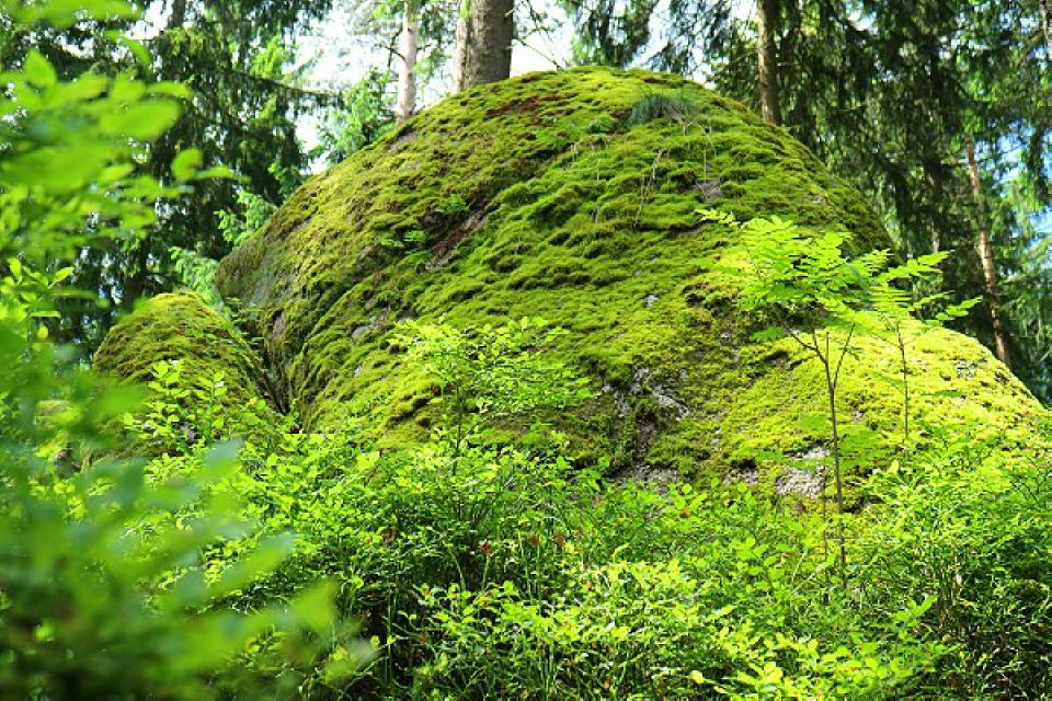 3. Augenstein. In direkter Nachbarschaft versteckt sich zwischen einigen Jungtannen ein riesiger Felsblock. Auf seiner Oberseite entdecken wir zwei fast auf einer Höhe nebeneinander liegende kreisrunde Schalen. Als hätte der Felsen seinen Blick gegen den Himmel gerichtet.