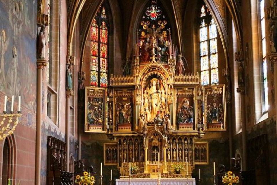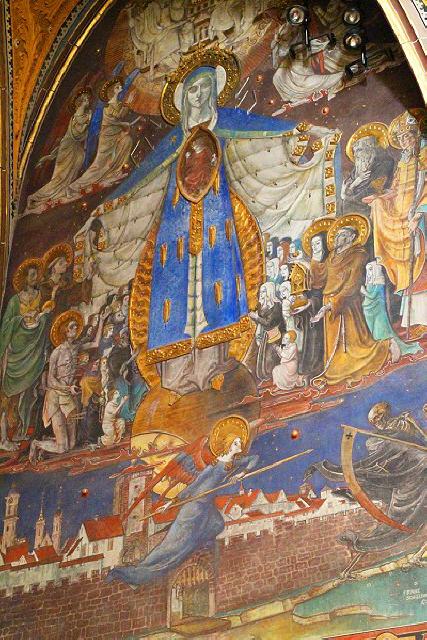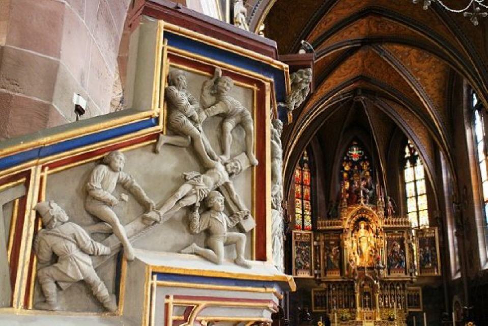 Auf der rechten Seite im Kirchenschiff begegnet einem eine seltene Steinplastik „coronatio peregrinorum”, eine Pilgerkrönung durch den Apostel Jakobus. Diese Figur stammt aus einer untergegangenen Jakobuskapelle und Pilgerstation vor der Stadt aus dem frühen 14. Jahrhundert.