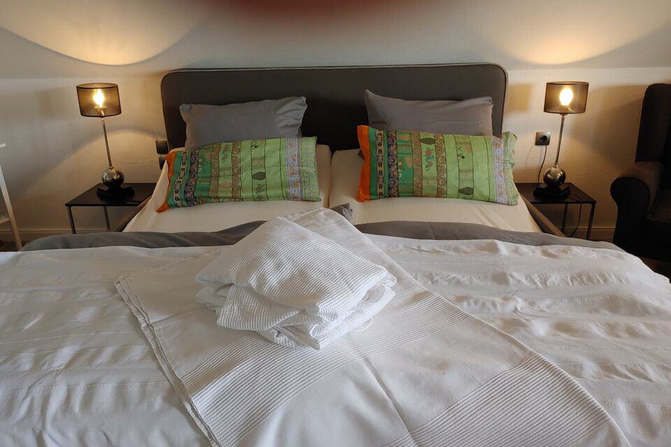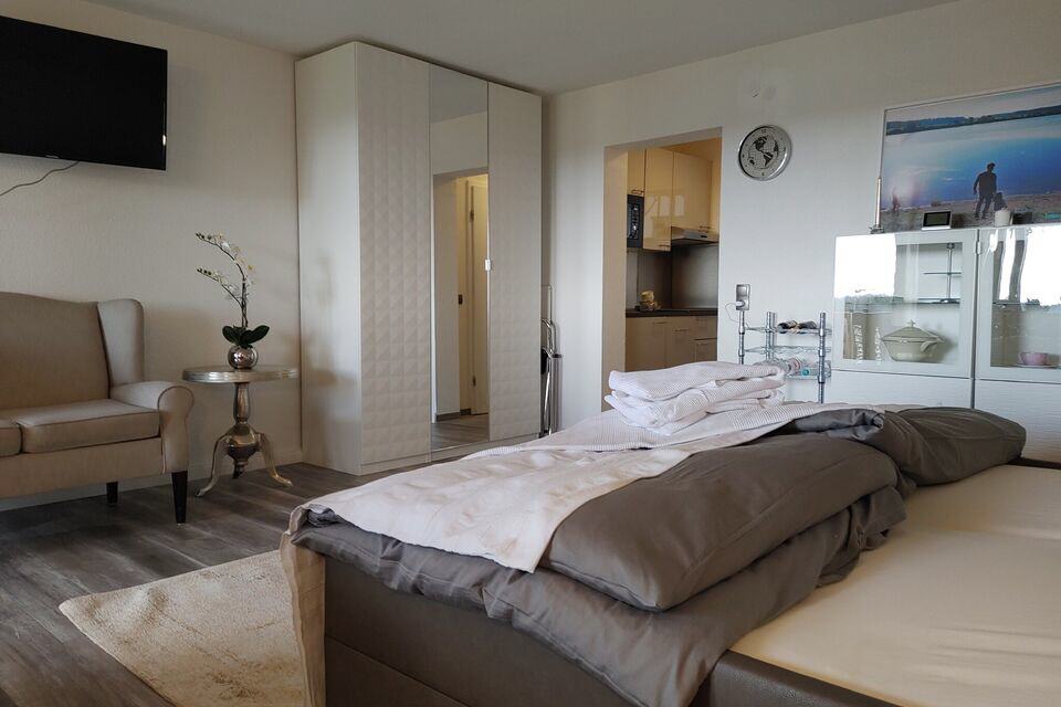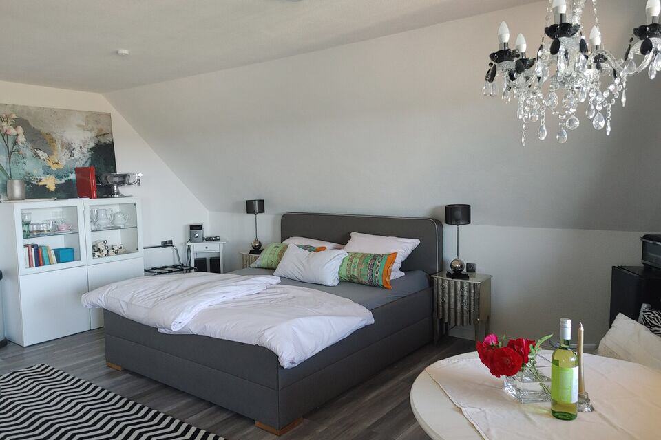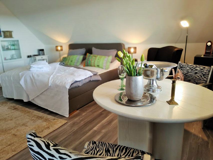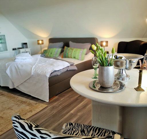 Das Appartement ist in dezenten hellen Farbtönen gehalten und erlaubt uns so eine jahreszeitlich passende Dekoration. Auf Teppichboden haben wir bewusst verzichtet, damit auch Allergiker sorgenfrei hier übernachten können und stattdessen einen eleganten, gut zu reinigenden Bodenbelag verlegen lassen.