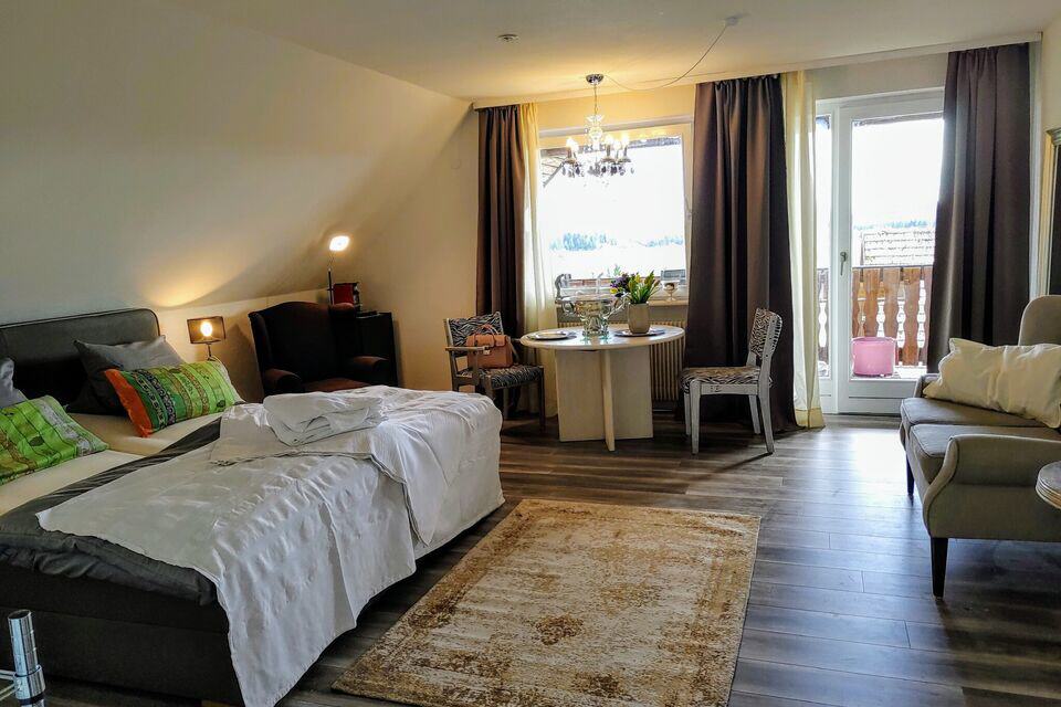• Herrliche Aussichten versprechen nicht nur der große Balkon, von dem aus Sie einen wunderschönen Blick in die Natur haben, sondern auch die vielen Freizeitaktivitäten, die Sie hier direkt vor Ort oder bei Ausflügen erwarten. In wenigen Gehminuten erreicht man vom Appartement aus den Kirnbergsee, der wärmste Badesee im Südschwarzwald. Im Sommer begeistern die ausgezeichnete Wasserqualität, gepflegte Strände und das flache Ufer Sonnenhungrige, Schwimmer und Wassersportler. Die naturbelassenen Uferzonen mit ihrer faszinierenden Pflanzenwelt, Wiesen und Wälder machen das Gebiet aber auch ganzjährig zu einem Eldorado für Spaziergänger, Radfahrer und Angelsportler. In knapp 800 Metern Höhe erwartet die Urlauber hier ein weit verzweigtes, gut ausgeschildertes Wegenetz für Wanderer und Radfahrer. Der zweieinhalb Kilometer lange Rundweg um den See begeistert Naturfreunde mit seinen Schilfgürteln, geschützten Ruhe-, Laich- und Brutplätzen für Fische und Vögel. Neben Wildgänsen und -enten sieht man hier Fischreiher und manchmal auch Eisvögel. Angler fischen nach Hecht, Karpfen, Schlei und Zander.