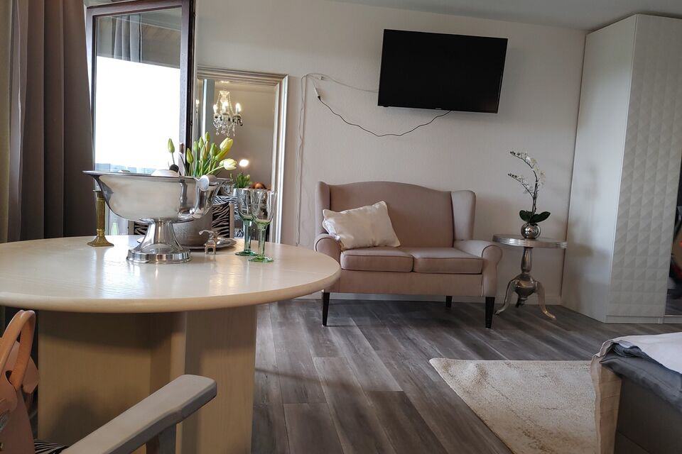 Ein komfortables kleines Badezimmer mit Dusche, eine kleine Küche mit Spülmaschine und allem, was Sie für Ihre kulinarische Selbstverpflegung benötigen, ein runder Esstisch, das bequeme, breite Doppelbett, ein großer Flachbildfernseher und ein Kaffeeautomat sorgen für ein perfektes Urlaubsfeeling. Sie können Ihre Mahlzeiten selbst zubereiten oder - wenn Ihnen mal nicht danach ist - einfach unten im Restaurant eine der lecker angerichteten Spezialitäten genießen. Auf dem Appartement-Balkon gibt es Sitzgelegenheiten für ein ungestörtes, romantisches Frühstück oder Dinner im Sonnen- bzw. Mondschein.
