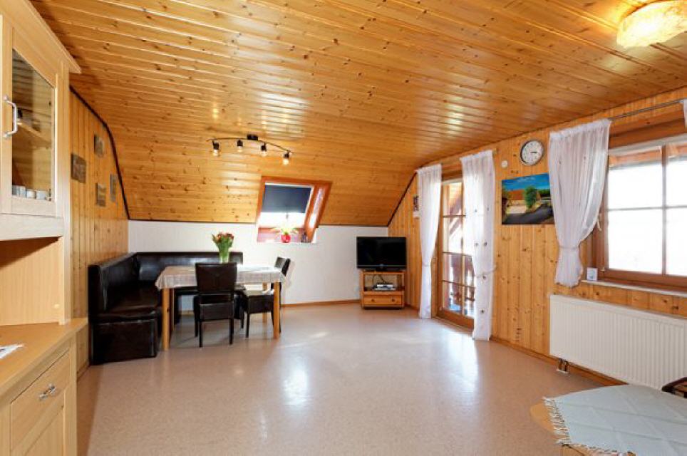In der gemütlichen Dachgeschosswohnung können Sie Ihren Urlaub genießen. Beobachten Sie vom eigenen Balkon aus Tiere am Waldesrand oder erfreuen Sie sich an der schönen Landschaft. Bettwäsche und Handtücher sind vorhanden und im Preis inklusive.