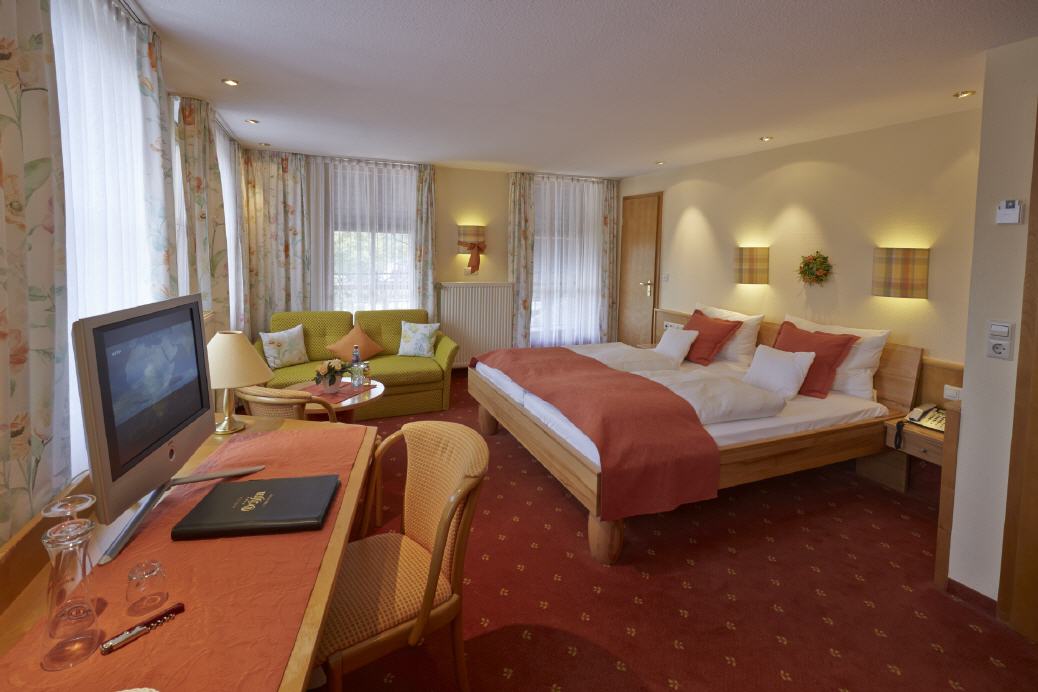 Doppelzimmer F – ca. 32 qm, mit Wohnbereich, Frühstück, Dusche/WC, Minibar, Safe, Kabel-TV, Telefon, sicheres GREEN-WIFI, Balkon oder Terrasse, Teppich- oder Holzboden,Bademantel, Saunatücher, 1-2 Zusatzbetten möglich , Nutzung der hoteleigenen Erholungseinrichtungen