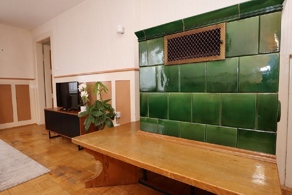Wohnzimmer mit TV-Gerät und Kachelofen