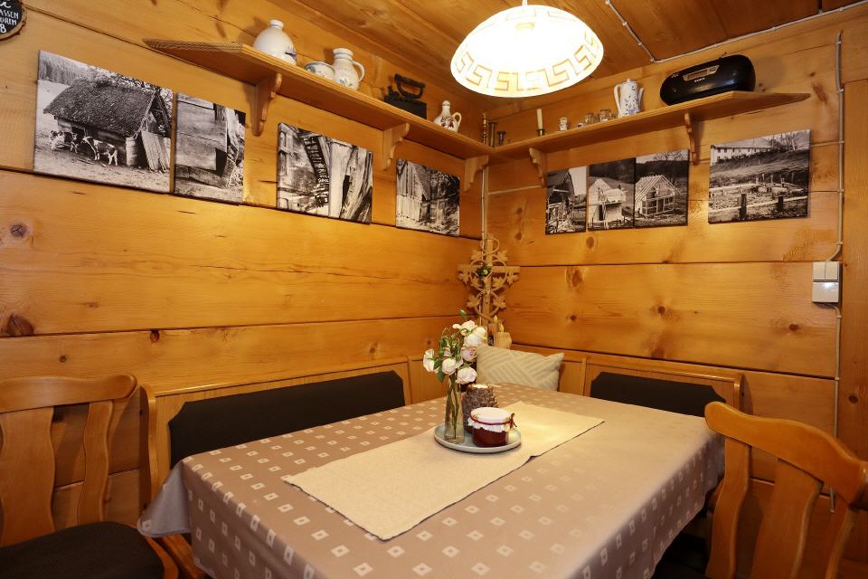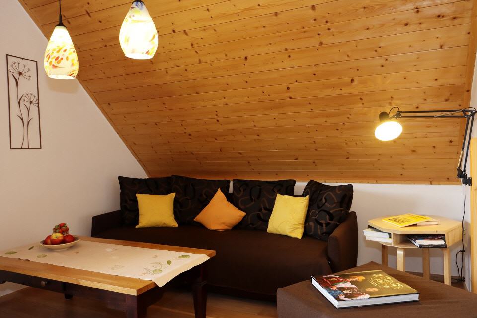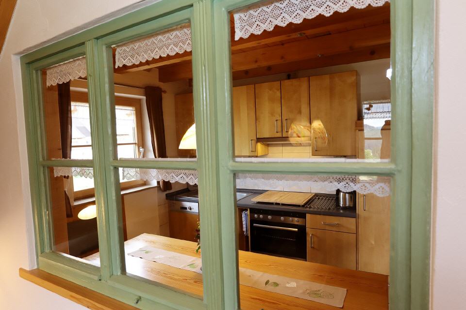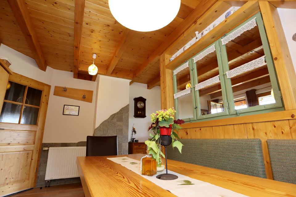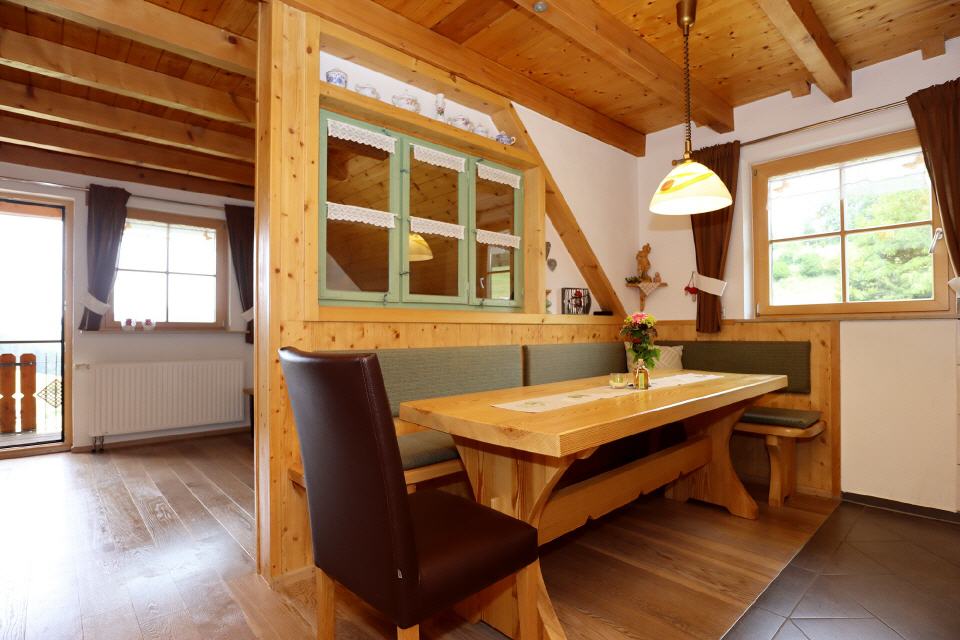 Die gemütliche Inneneinrichtung wurde größtenteils aus hofeigenem Holz von örtlichen Handwerkern angefertigt. So lädt zum Beispiel die schöne helle Küche mit ihrer großen Essecke zum gemütlichen Beisammensein ein. Der behagliche Wohnbereich ist unter anderem mit einer großen bequemen Couch und einem Flachbild Sat-TV ausgestattet. Die Ferienwohnung verfügt über zwei separate Schlafräume. Ein Zimmer davon ist mit einem Doppelbett und das andere Zimmer mit zwei Einzelbetten möbliert. Das moderne Bad verfügt neben einer großen Dusche, WC, Kosmetikspiegel und Fön auch über eine Fußbodenheizung.
