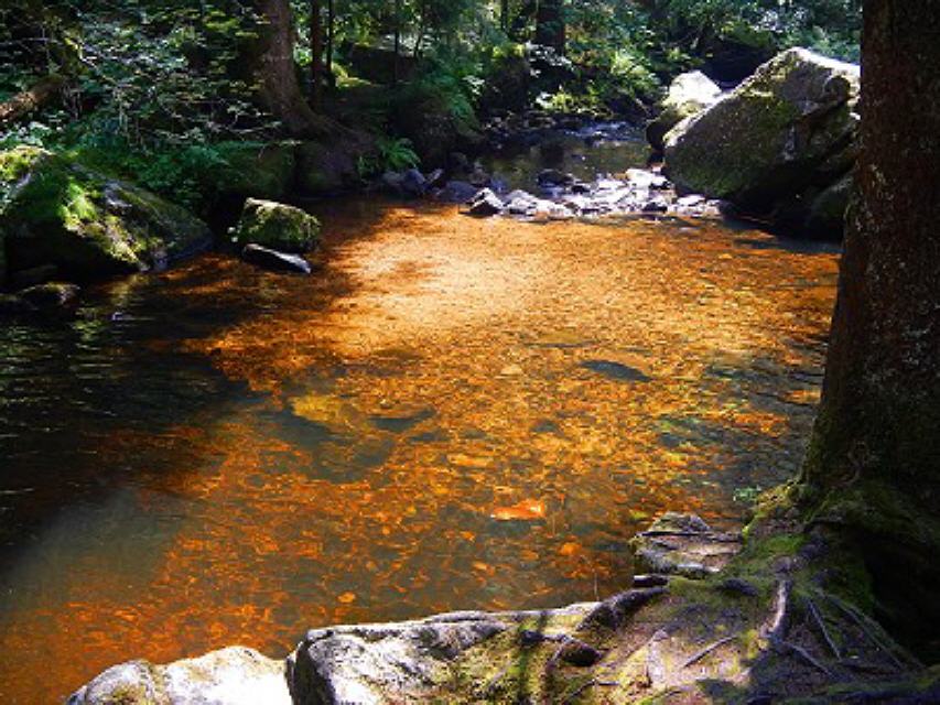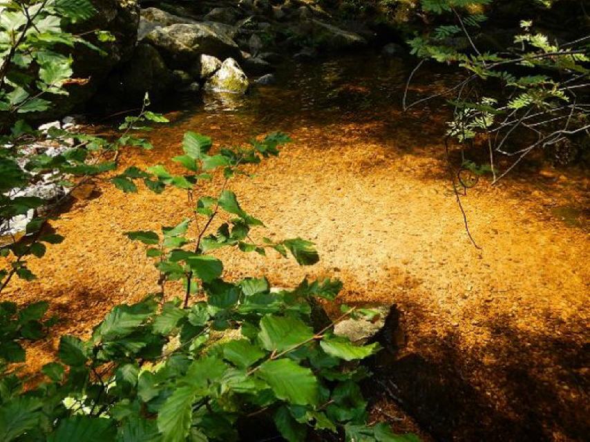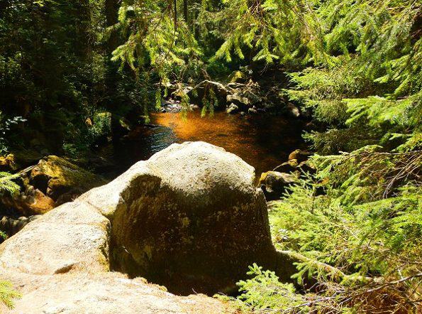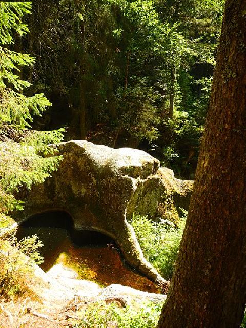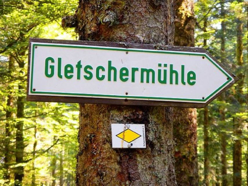 Von hier aus empfiehlt sich rechts ein Abstecher zur knapp 400 Meter entfernten Gletschermühle. Der kleine Umweg lohnt sich unbedingt. Zwei kreisrunde Becken mit gewaltigem Durchmesser bildeten sich in der Rißeiszeit. Dabei wurden die Steine unter einem Gletscher bewegt und die runde Form herausgemahlen. Übrigens, das dunkle bis rotbraun eingefärbte Wasser hat seine Farbe aufgrund der von den Pflanzen abgegebenen Huminsäure. Sie können sich also beruhigt ein erfrischendes Bad gönnen.