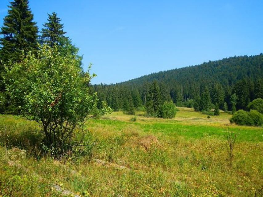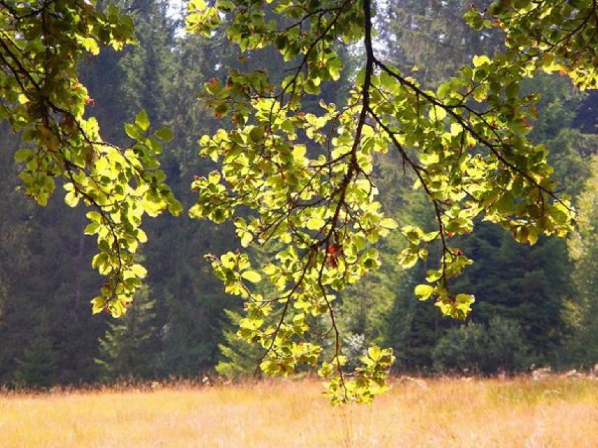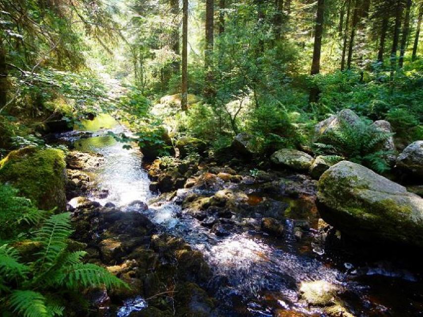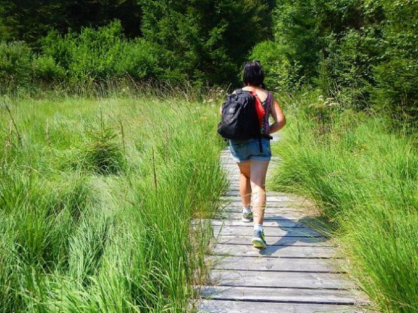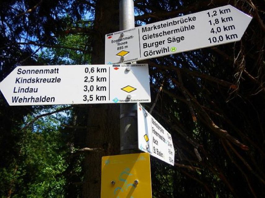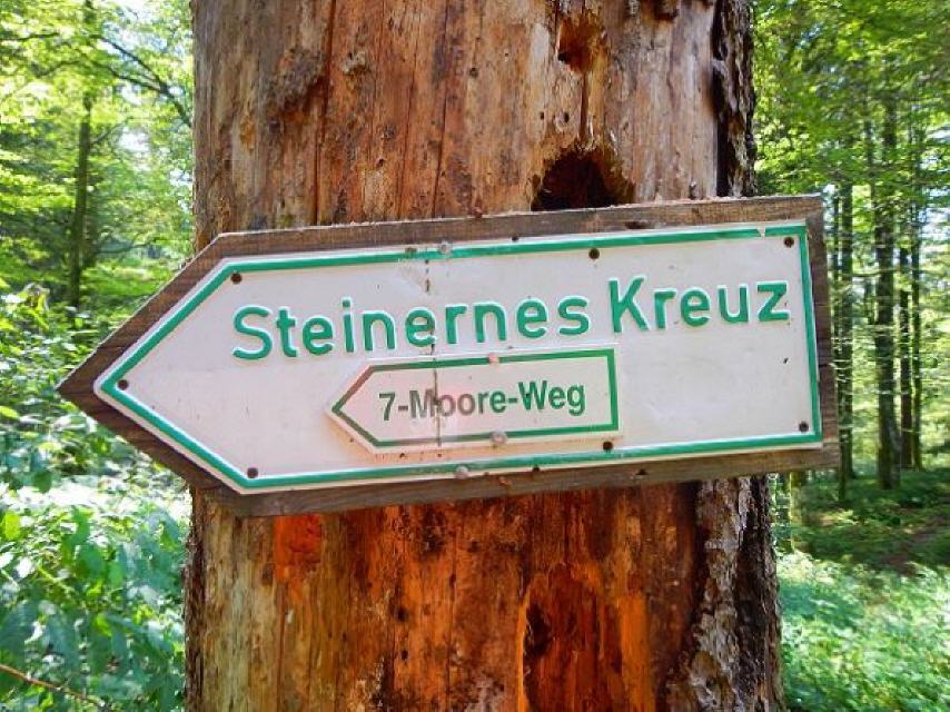Nach der Erfrischung gehen Sie zurück zur “Schwarze Säge”, folgen der Teerstraße (leider!) entlang des Schwarzebächle zur “Marktsteinbrücke”. Rund 900 m weiter erreichen Sie das Birkenmoos, das sie auf einem 200 m langen Holzsteg durchqueren können. Ein Blick zu beiden Seiten des Steges offenbart die einzigartige Flora im Moor. Beim Schilderstandort “Sonnenmattmoos” führt der Weg nach links zum Sonnen mättlemoos, das siebte und letuzte Moor erreichen Sie nach der “Sonnenmatt” mit dem Brunnenmättlemoos. Nach Überqueren der L151 geht’s steig bergauf über den Grenzweg und “Kindskreuzle” zurück zum Ausgangspunkt, dem Parkplatz Steinernes Kreuz.
