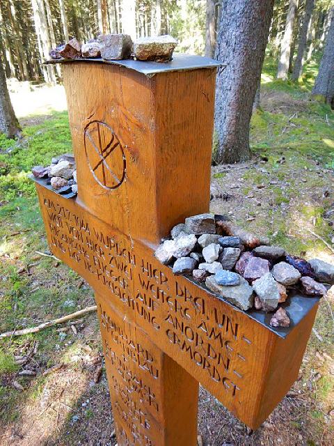 Weiter geht`s in den Wald; bald wird im Wald die Höhe erreicht; von dort aus links halten. Zwei Gedenkkreuze erinnern an ein dunkles Kapitel der Geschichte. Auf Geheiß der Nazis wurden hier im Juli 1944 fünf amerikanische Flieger nach einem Fallschirmabsprung erschossen.