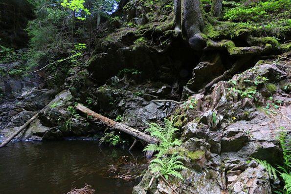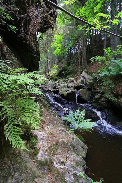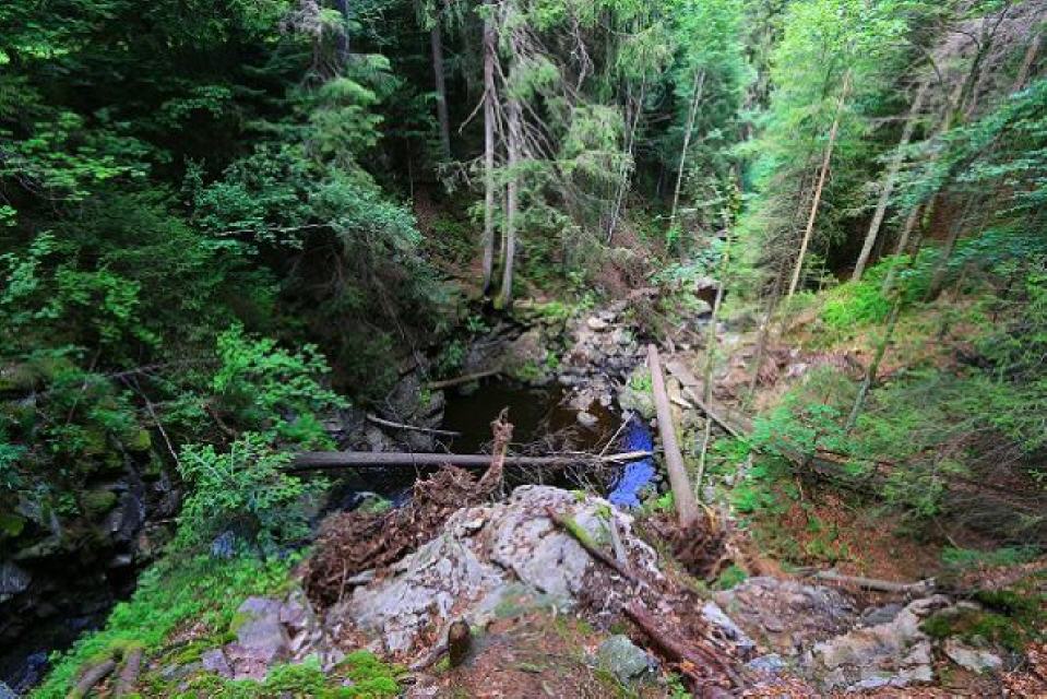 Am Wasserfall führt eine hölzerne Treppe hinunter. Aufgrund von Sturmschäden ist jedoch Vorsicht geboten. Die ehemalige Brücke ist selbst nach Jahren zerstört und nicht wieder ersetzt worden. Jedoch lässt sich der Gebirgsbach über die im Wasser liegenden Steine überqueren. Auf der anderen Seite führt ein hölzerner Weg weiter und wird von einem ansteigenden Waldweg abgelöst. Beim Aufstieg durch den Wald links halten und auf der ersten Straße fast ebenerdig zurück zur Kuranlage laufen.