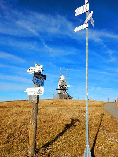 Gehen wir weiter durch den Grüblesattel zum eigentlichen Feldberg-Gipfel (1493 m). Es ist die westlichste Erhebung und ist mit einer Rundum-Aussichtsplattform versehen. In unmittelbarer Nachbarschaft befindet sich die Wetterstation.