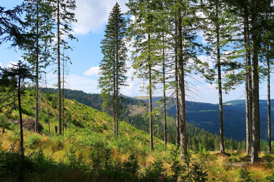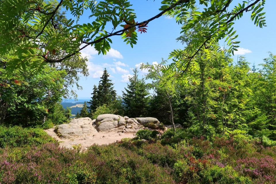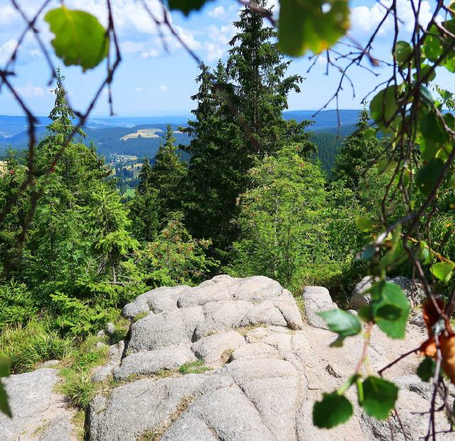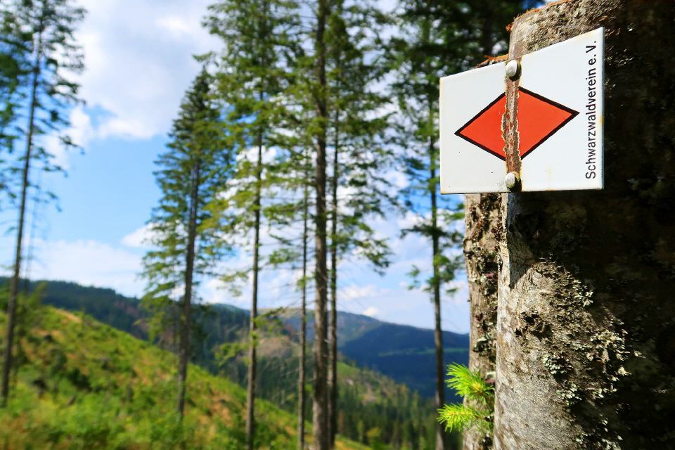 An der Wasserlochhütte gelangt man auf eine Wanderwegekreuzung; hier biegen wir rechts in den Zweiseenblickweg ein. Weiter geht es über den Zweiseenblick, der einen herrlichen Panoramablick über den Hochschwarzwald und zu den zwei Seen bietet. Nordöstlich des Titisee liegt der Titisee, südöstlich der Schluchsee. Beim Zweiseenblick befinden sich auch rustikale Bänke und Tische. Eine kurze Rast empfiehlt sich vor dem Abstieg. Auf dem weiteren Weg kommt noch der Aussichtspunkt Feldbergblick. Ab diesem höchsten Punkt der Tour geht es deutlich abwärts. Etwa 5,3 km kann man rechts in den Philosophenweg einbiegen, der uns etwas an Höhe gewinnen lässt. Hier plätschern kleinere Bäche. Sie fließen nach Osten und in Neuglashütten zur Haslach, einem Zufluss der Wutach. Auch der Schwarzenbach gesellt sich dazu.