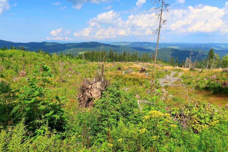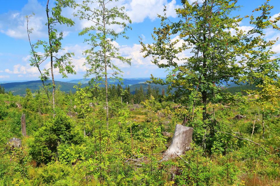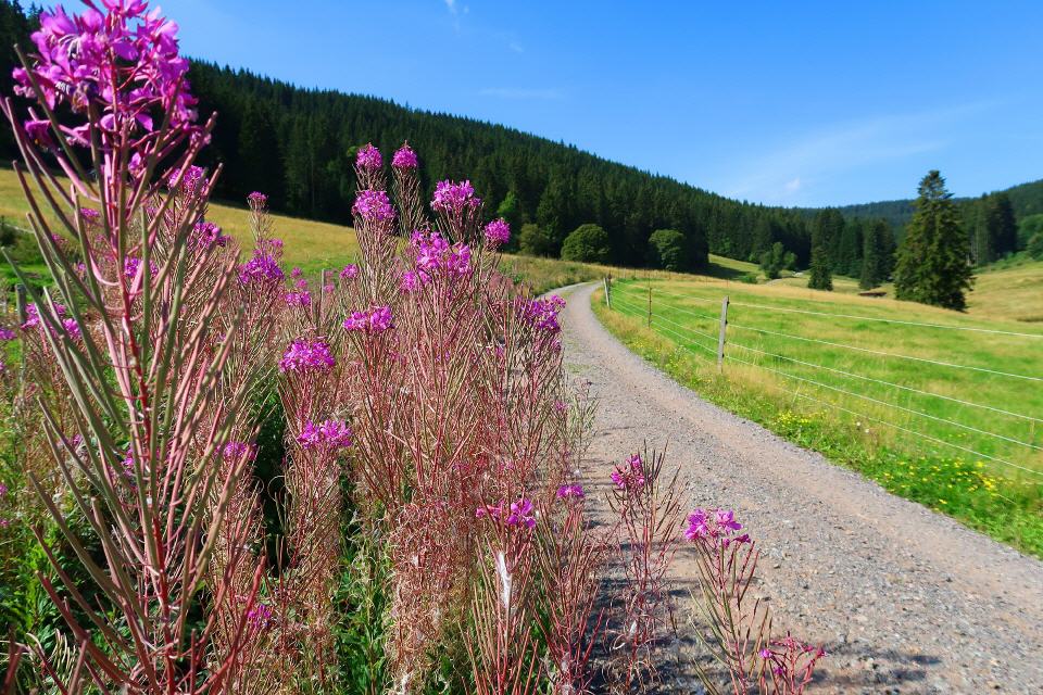 Eine andere Möglichkeit ist, den Philosophenweg rechts liegen zu lassen und ein kleines Stück talwärts in Richtung Bärental, jedoch nach Neuglashütten abzubiegen. Es dauert nicht lange, dann öffnet sich der Wald in eine herrliche Bergwiesenlandschaft. Neuglashütten ist erreicht. Am Ende des kleinen Ortes rechts über eine Kuhweide geht es in Richtung B 500 und Altglashütten weiter.