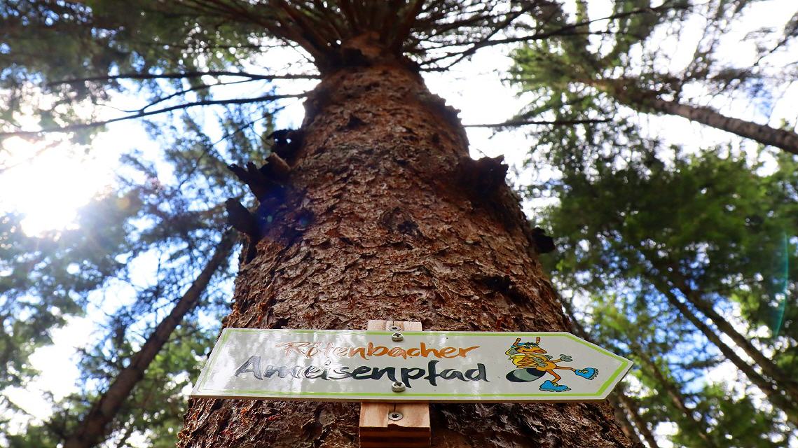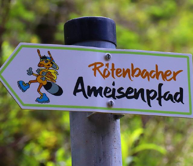 Einmal richtig auf Abenteuer gehen können Familien auf dem Rötenbacher Ameisenpfad. Die Strecke ist nur 3,6 km lang; bei normaler Gehgeschwindigkeit ist der nicht kinderwagentaugliche Weg in 1,5 Stunden zu bewältigen. Gutes Schuhwerk und Trittsicherheit sind erforderlich.