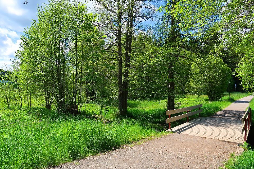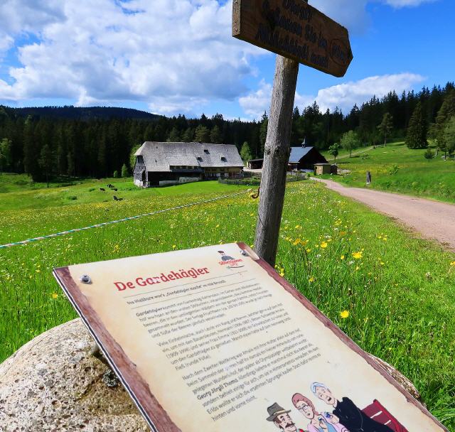 Am Parkplatz hinter dem Kurhaus in Hinterzarten wirst Du schon vom Säbelthoma begrüßt. Alternativ kann die Tour an der Kirche begonnen werden. Der Säbelthoma, ein ehemaliger Dorfpolizist, übernahm die Aufgabe, die neusten Nachrichten zu verkünden und erzählt Dir entlang des Weges einige davon. Hier startest Du die Tour durch den Kurgarten, am Zartenbach entlang bis zum Spielplatz im Wolfsgrund. Nun machst Du Dich an den Aufstieg zum Hotel Sonnenberg und folgst dann dem Westweg, vorbei am Kesslerhofweiher.