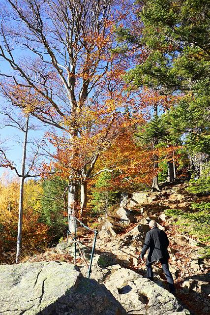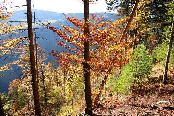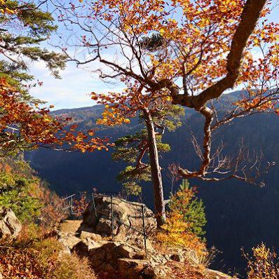 Weiter geht es leicht abwärts nach Westen in Richtung Buchenbach – Himmelreich und passieren den Hirschsprung. Vom Höhenweg aus ist er leider nicht zu sehen. Der Hirschsprung verdankt seinem Namen einer Sage. Demnach begab sich der Ritter der Burg Falkenstein auf Hirschjagd. Nach einiger Zeit entdeckte er einen prachtvollen Hirsch, doch dieser, getrieben von Todesangst, entkam dem Jäger mit einem gewaltigen Satz über die Schlucht. Damals war die Schlucht an dieser Stelle nur neun Meter Breit; im Zuge des Straßenbaus wurde die Engstelle später vergrößert. Die größte Erweiterung wurde schon 1638 von 2000 französischen Soldaten gemacht.