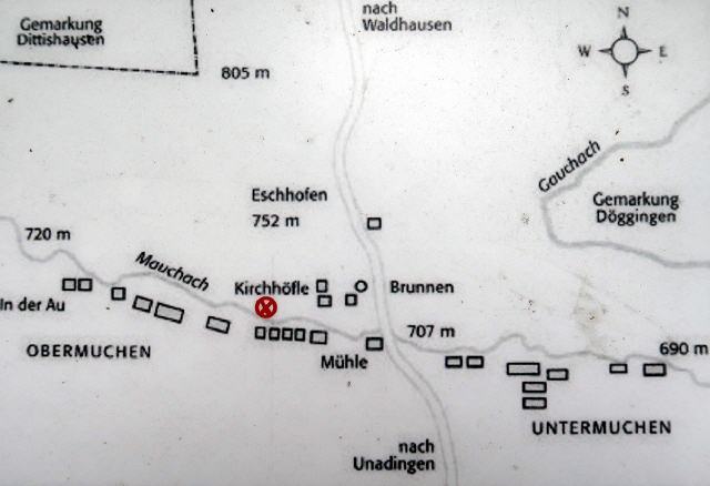 In dem von der Mauchach ("Muchen") durchflossene Bachtal zwischen Dittishausen und Unadingen lag einst ein Dorf gleichen Namens. Darüber hat der Löffinger Heimatforscher Emil Ketterer geforscht.Sein keltischer Name bedeutet "Kleine Ansiedlung". Im nördlich anstoßenden Unadinger Großwald sind über 250 gut erhaltene, aus Fundsteinen aufgeschichtete Grabhügel zu sehen. Sie werden der von 1800 bis 1200 v.Chr. gerechneten Bronzezeit zugeordnet. In der Hallstattzeit (750 bis 350 v. Chr. hat das Volk der Kelten die alten Hügel zu Nachbestattungen benutzt. Alle diese Grabfelder sind der Siedlung "Muchen" zuzuweisen. 20 noch gebräuchliche Flurnamen sind keltischen Ursprungs. Erstmals schriftlich genannt wird das Dorf im jahr 1150. Der Stauferkönig Konrad II. schlichtete in Schaffhausen einen Streit zwischen den beiden Klöstern St. Blasien und Allerheiligen. Rupert und Lutold von Muchen bei Löffingen und Herzog Konrad von Zähringen legten Zeugnis für St. Blasien ab. 1175 verwaltete ein Burkard aus Muchen den Hof des Klosters St. Blasien. In den folgenden Jahrzehnten wurde das Dorf immer mal wieder genannt, letztmalig im Jahr 1506, als Graf Wolfgang von Fürstenberg es an den Herren Philipp von Almshoven zu Immendingen verlieh. Beim Untersuchen von Maulwurfshügel im Gewann Kirchhöfle trat neben Brandschutt eine 20 cm hohe Tonfigur ohne Kopf zutage. Zwischen 1506 und 1513 ist das 1,5 km weit auseinander gezogene Dorf vermutlich einem gewaltigen Hochwasser zum Opfer gefallen. Außer dem Kirchhöfle standen alle Gebäude südlich des Bachlaufes auf tonigen Keuperböden. In den Jahren 1804 und 1895 sind ganze Hänge abgerutscht. So sind die Terrassen entstanden. Langgezogene, tiefe Spalten im Erdreich und sich neigende Waldbäume bezeugen die andauernde Bewegung der Hänge.