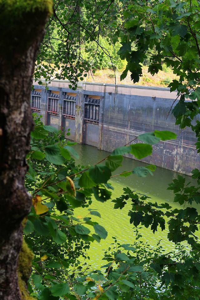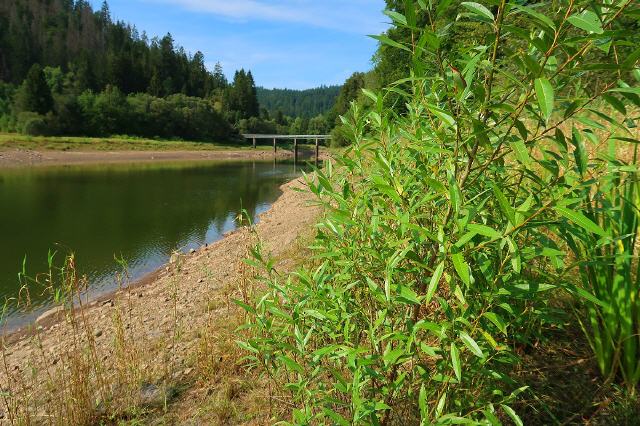 Dann bleibt man auf der rechten Seite des Ufers und beginntden See zu umrunden. Wenig später erreicht man eine Kneipp-Anlage am Albstausee, die versteckt im Wald einen Blick auf den See gewährt. Hier kann man die Füße im Wasser abkühlen und die Waldluft genießen. Erholt geht es weiter den Seerundweg entlang bis zur Staumauer.