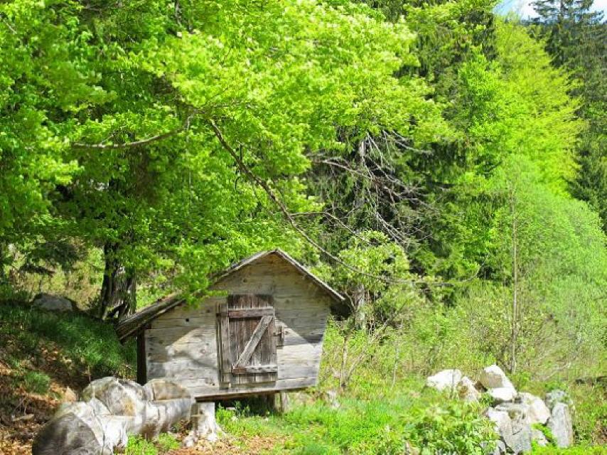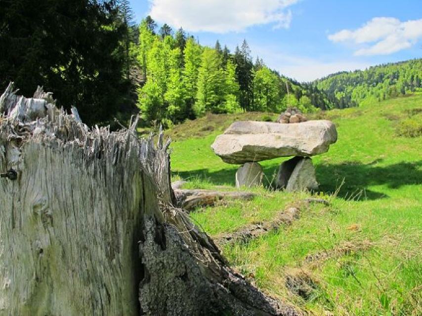 Ein Rastplatz lädt ein, sich die Kluse näher anzuschauen. Nach einer kurzen Pause passieren wir die drei End-Moränen. Wir halten uns westlich der Alb und erreichen die Abzweigung „Schesslong dü Boah“. Über einen schmalen Wiesenpfad kommen wir zu einem Waldsofa und der Knüppelcouch „Schesslong dü Boah“.