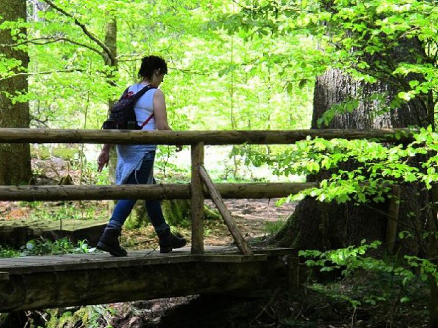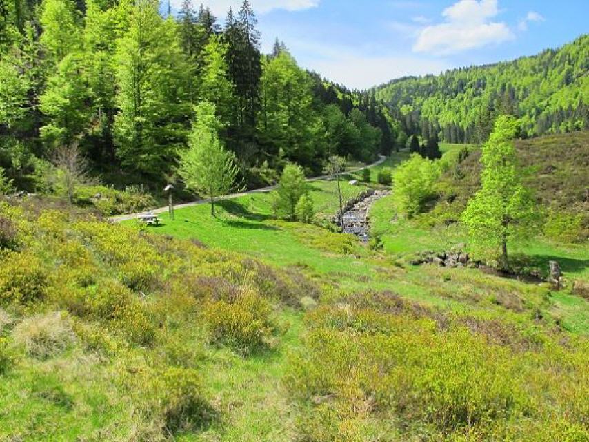 Nach dem Wasserfall haben wir die Möglichkeit zur Einkehr im Café & Berg Beizle „Zum Kuckuck“. Anschließend folgen wir dem Asphaltweg ein kurzes Stück bergan bis zur Übersichtstafel. Von dort geht es auf einem Menzo-Weg über den Weidberg, den Kohlbrunnen bis zu einem besonders schönen Erlen-Wäldchen und den beiden Radon- und Fluorit-Quellen. Über eine Krunkelbach-Brücke kommen wir zum Brandweg, überqueren diesen und folgen dem Pfad oberhalb der Lesestein-Mauer über die Krunkelbach-Weiden Richtung Osten.