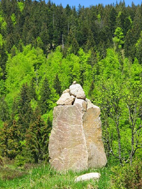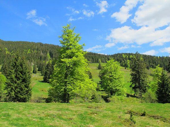 Halbrechts abbiegend folgen wir dem Schwarzbergweg (Richtung Zweiseenblick). Es geht bergan und wird steinig und ein wenig rauer. Ein Weg, wie ihn die Ziegen lieben und wer weiß, vielleicht sind ja auch Wald-Wuseli zu entdecken?! Wir folgen dem Pfad, die Landschaft öffnet sich und der Blick geht zu den End-Moränen des ehemaligen Feldberg-Gletschers der hier an die 400 m hoch alles überdeckte.