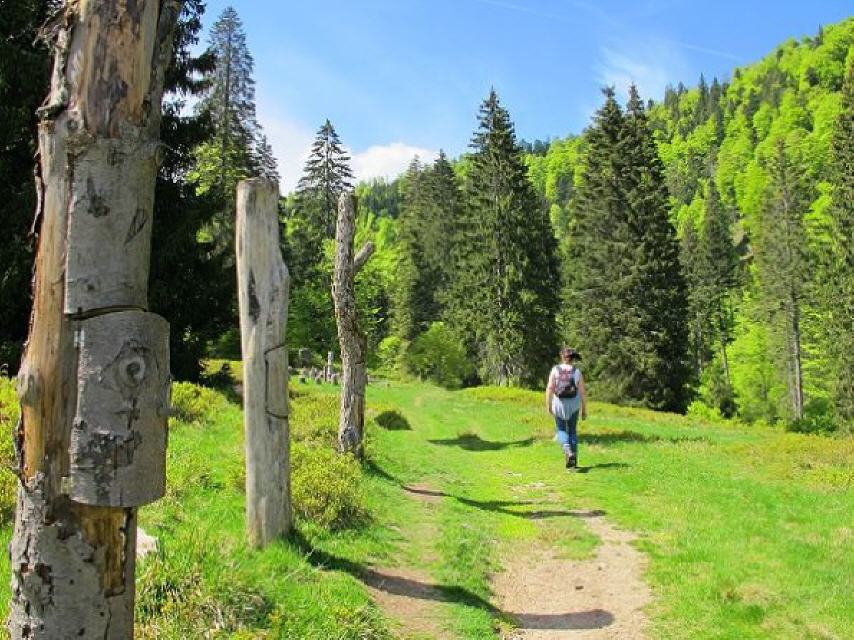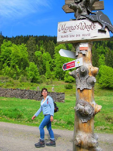 Beginnend am Mösle-Parkplatz (880 m) geht es, nachdem wir die Menzenschwander Alb überquert haben, kurz durchs Hinterdorf, vorbei an typischen Schwarzwaldhöfen. Am Schwarzbergweg biegen wir links ab und gehen das Asphaltsträßchen bis zum Ende bergauf. Nun folgen wir einem schmalen Pfad. Auf halber Talhöhe folgen wir dem Wildapfelpfad. Nach wenigen Metern sehen wir im Westen ins Krunkelbachtal und in der Ferne das Herzogenhorn (1415 m). Die höchste Erhebung im Landkreis Waldshut. Denn dieser Zipfel am Feldbergmassiv gehört politisch zum Landkreis am Hochrhein. Gleich oberhalb beginnt der Breisgau-Hochschwarzwald.