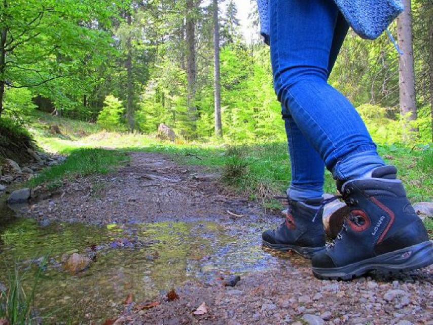 Kurz vor einer Ruhebank wählen wir den etwas breiteren Pfad und gehen bergab über den Gschweihweg.