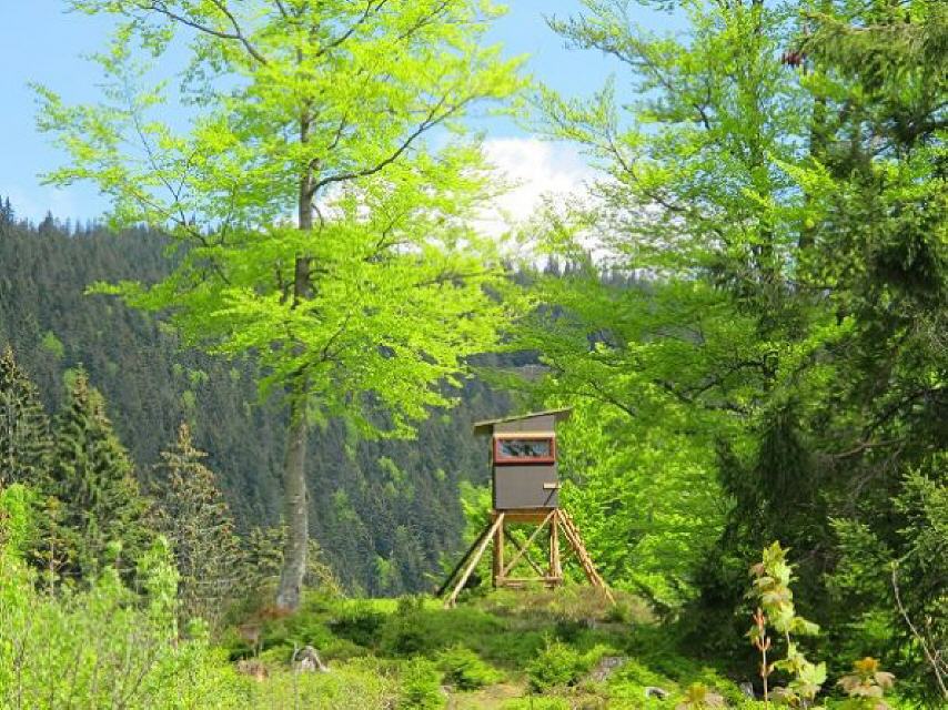 Nach wenigen Metern öffnet sich der Wald und gibt einen herrlichen Blick frei ins Klusenbachtal. Vorbei an einem alten Köhler-Platz geht es talabwärts.