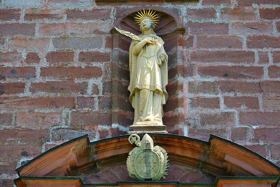 Die harmonische Verbindung des kunstvollen Chorgitters mit den Altären vor dem Chor und dem Hauptaltar findet ihr Pendant an der Westwand der Kirche in der prächtigen Orgelempore mit einem filigranen Gehäuse. Es ist von der Figuren der Patronin der Kirchenmusik, Cäcilia, des königlichen Psalmensängers David und musizierender Engel gekrönt, die beschwingt umeine Uhr von Matthias Faller schweben. Er wirkte als Holzbildhauer in den Klöstern St. Märgen und St. Peter.