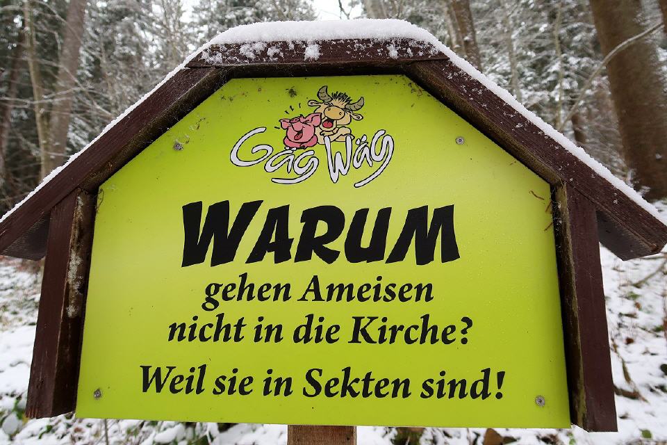 Auf diesem nur 5,6 km langen Rundwanderweg gibt es garantiert jede Menge zu lachen. Denn der Gäg-Wäg ist ein Witzeweg, wie es ihn wohl kein zweites Mal gibt. Er führt durch den Wald entlang der Hochebene von Schwärzenbach bei Titisee-Neustadt. An 20 Stationen warten coole Witze und Sprüche, aber auch kuriose Bauwerke und Tafeln. Ganz nebenbei kann man die Aussicht über Schwärzenbach genießen.