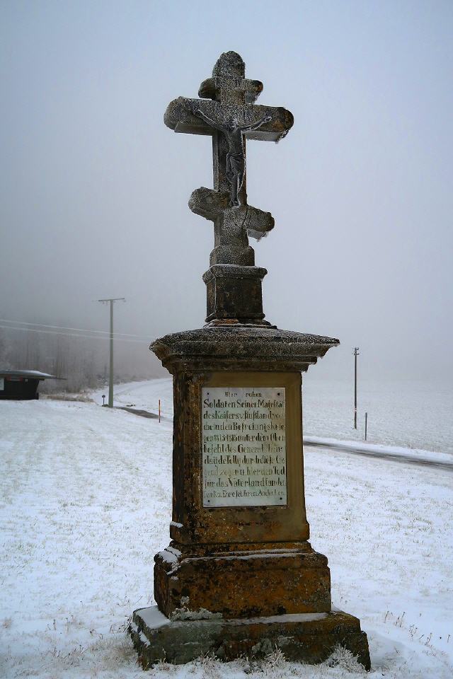 Russenkreuze erinnern im Hochschwarzwald an die Russen, die nach der Völkerschlacht von Leipzig die napoleonischen Truppen verfolgt hatten. Seit der Schlacht an der Beresina jagten die vereinigten Truppen die Franzosen buchstäblich nach Hause. So kamen sie in den Schwarzwald. Das Kreuz auf der Hochebene in Schwärzenbach zwischen dem Hochebenehof und dem Ebenemooshof datiert von 1906. Errichtete wurde es von einem Dr. Schinzinger aus Freiburg, der sich mit den Befreiungskriegen befasst hatte und Schriften veröffentlichte. Als Anerkennung verlieh ihm der Zar einen Orden. Aus Dankbarkeit ließ Schinzinger das Russenkreuz in Schwärzenbach und auch ein zweites beim Bärenhof in Schollach errichten. Dass dies im Kirchspiel Friedenweiler geschah, zu dem Schwärzenbach und auch Schollach gehörten, liegt wohl daran, dass der Freiburger immer mal wieder im Schneckenhof in Schollach urlaubte. Das belegt das dortige Gästebuch. Bei allen Russenkreuzen sind Gedenksteine aus der Zeit der Befreiungskriege zu finden. Sie wurden nur für russische Soldaten errichtet, die beim Durchzug erkrankten, von ihren Einheiten zurückgelassen wurden und hier starben. Oft waren sie an der Ruhra oder den Blattern erkrankt. Weil sie orthodoxe Christen waren, wurden sie irgendwo vergraben und durften nicht in der katholisch geweihten Erde, dem "Gott's Acker", beigesetzt werden.