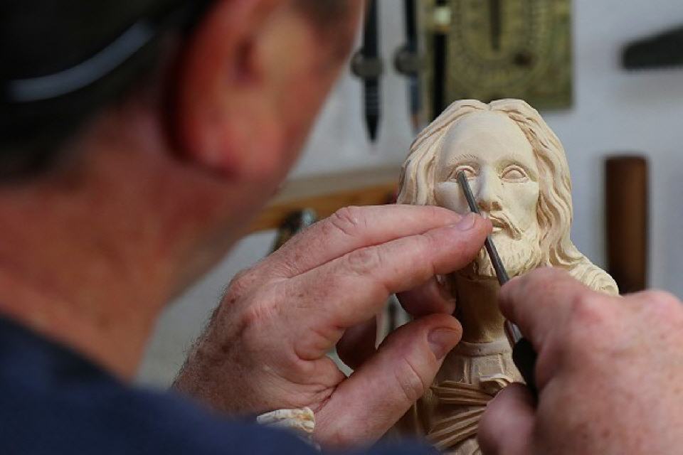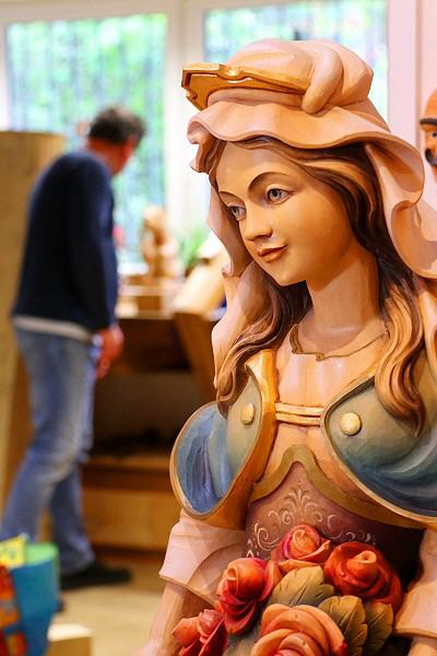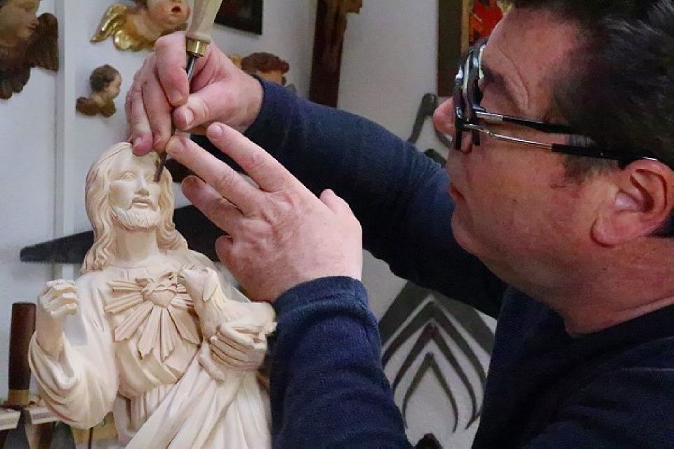 Wer das Geschäft beim Bahnhof in Titisee betritt, spürt sofort die besondere Atmosphäre. In der Luft liegt der angenehme, beruhigende Duft von Holz. In den Regalen reihen sich unendlich viele Figuren, Masken, Krippen und Holzwaren für den täglichen Gebrauch. Ein Durchgang führt in den hinteren Bereich. Dort ist die Werkstatt. Erich Holzer arbeitet die filigranen Gesichtszüge einer Madonnenfigur heraus. Die Arbeit ist beinahe fertig.